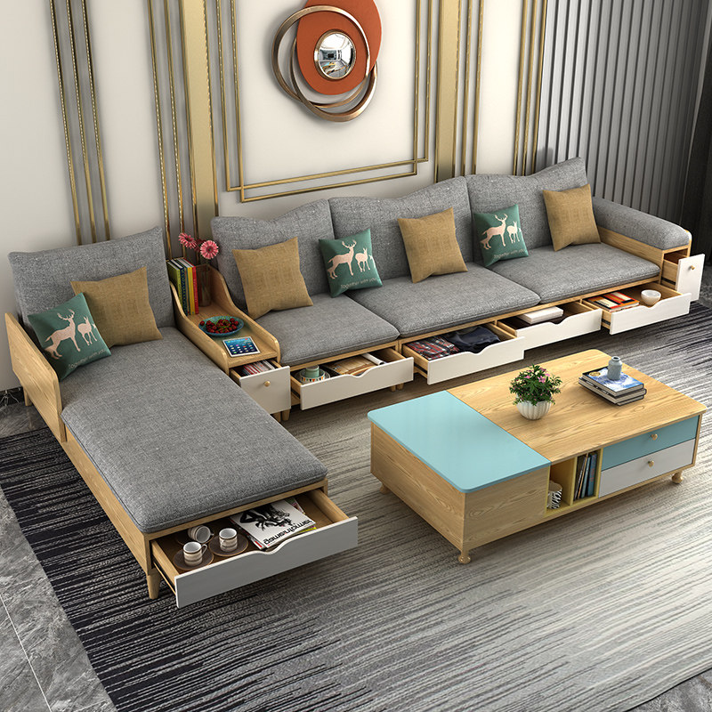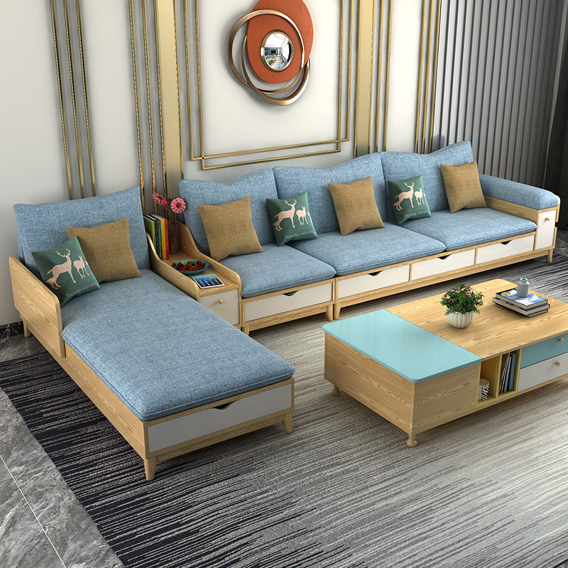 Nordic small-sized fabric sofa combination living room self-contained multifunctional storage latex corner imperial concubine solid wood sofa
