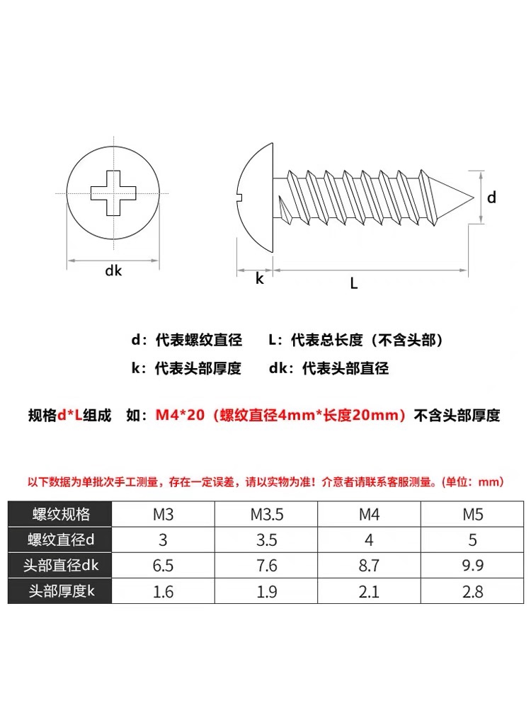 201 stainless steel mushroom head self-tapping nail TA cross large flat head self-tapping screw M3M4 * 6x8x20x35x45
