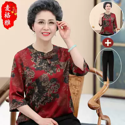 Middle-aged and elderly summer clothes female grandmother T-shirt Tang suit wide wife suit fat mother silk satin top plus fat increase
