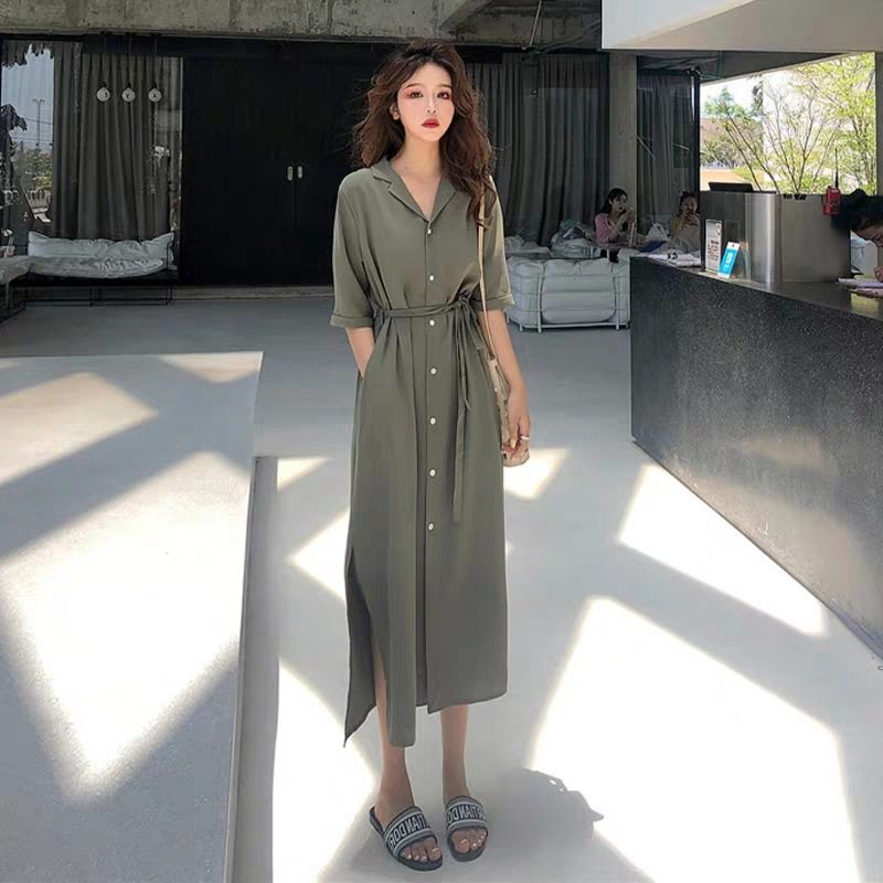 South Korea 2022 summer new Japanese shirt-style dress women's French bellflower retro waist and thin over the knee long skirt