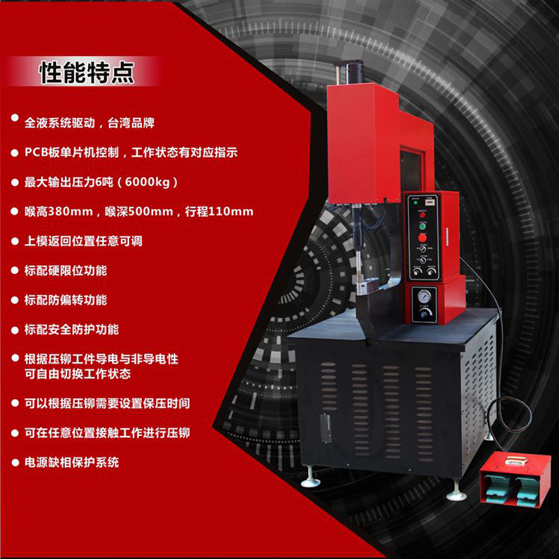 Hydraulic Pressure Riveting Machine 4T (excluding automatic feeding) Hydraulic Pressure Riveting Machine 6T (excluding automatic feeding) Pneumatic Pressure Riveting Machine 5T (excluding automatic feeding) Pneumatic Pressure Riveting Machine 8T (excluding automatic feeding) Helmet Automatic Riveting Machine (including automatic nail feeding) Additional automatic feeding system To increase an automatic feeding specification of 6 tons of pressure 4 tons of pressure