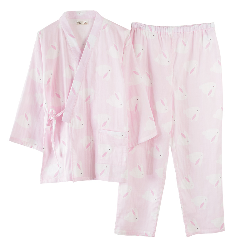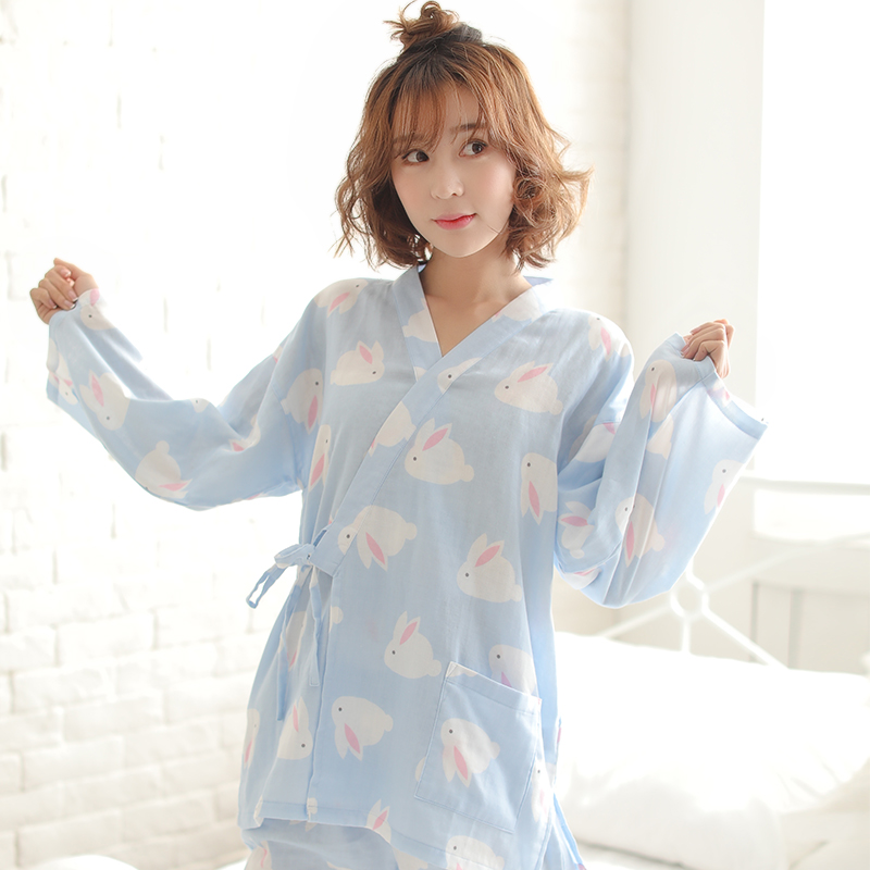Japanese-style cotton pajamas ladies spring and summer Japanese cotton double-layer gauze long-sleeved kimono sweat steaming homewear suit