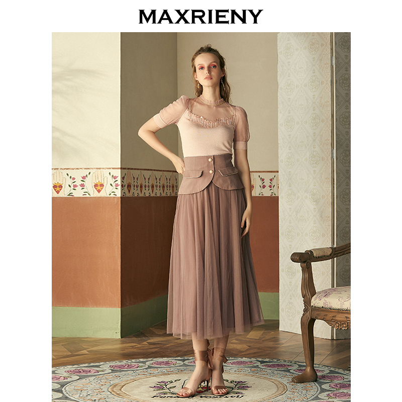 MAXRIENY 2020 spring retro solid color wool sweater women's short five-point sleeve lace top slim fit