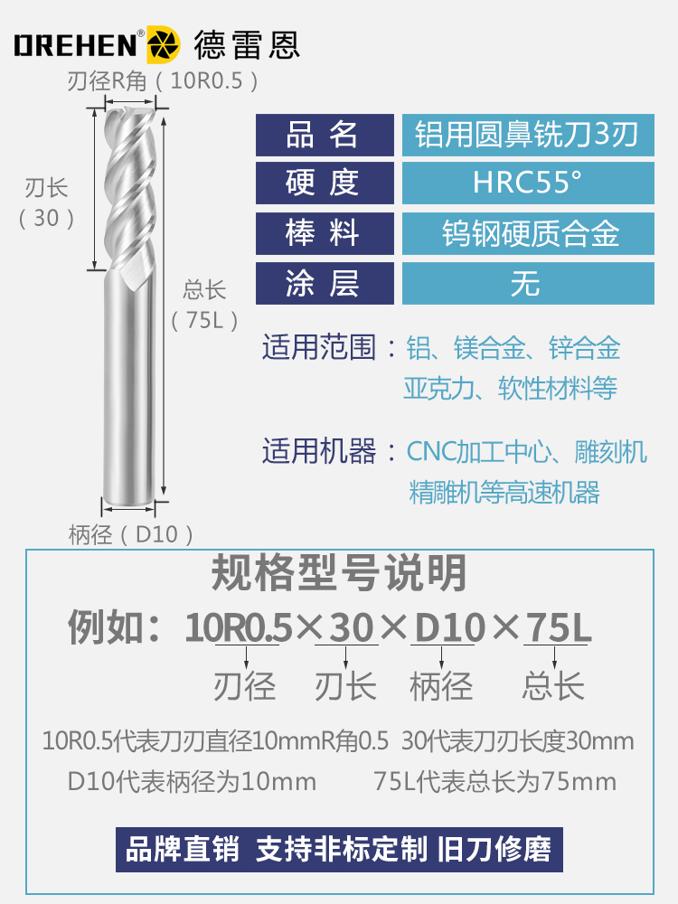 Tungsten steel alloy aluminum milling cutter 3 edge R angle r2 round nose milling cutter 6 8 10 12 16 20 lengthening 100 150