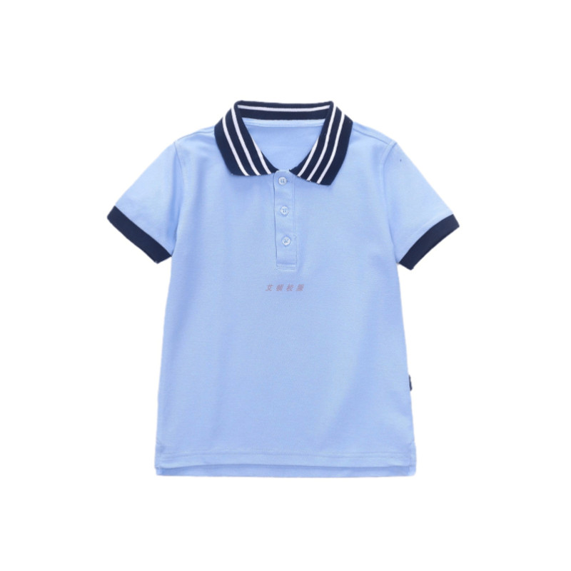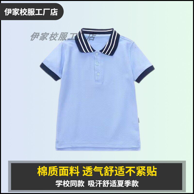 Yijia school uniform lake blue primary and secondary school students summer college short-sleeved lake blue white striped short-sleeved T-shirt polo shirt