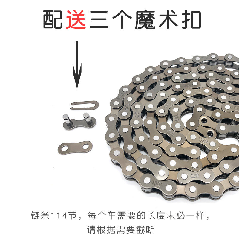 Single speed 98 knot chain - suitable for 12-20 inch stroller (free 3 magic buckles) Single speed 114 chain - suitable for folding car Mountain bike (get 3 magic buckles) Single speed 98 knot chain + chain trunter - suitable for 12-20 inch stroller (get 3 magic buckles) Single speed 114 car chain + chain trunter - suitable for folding car Mountain bike (get 3 magic buckles)