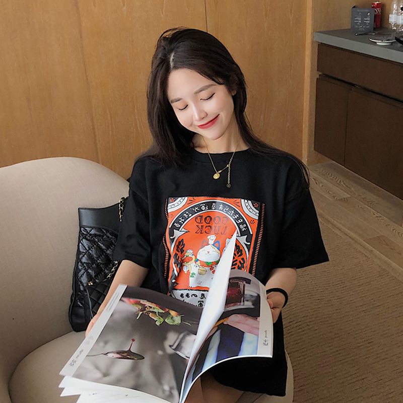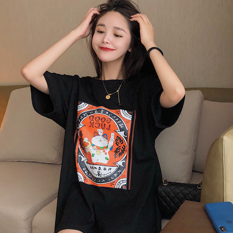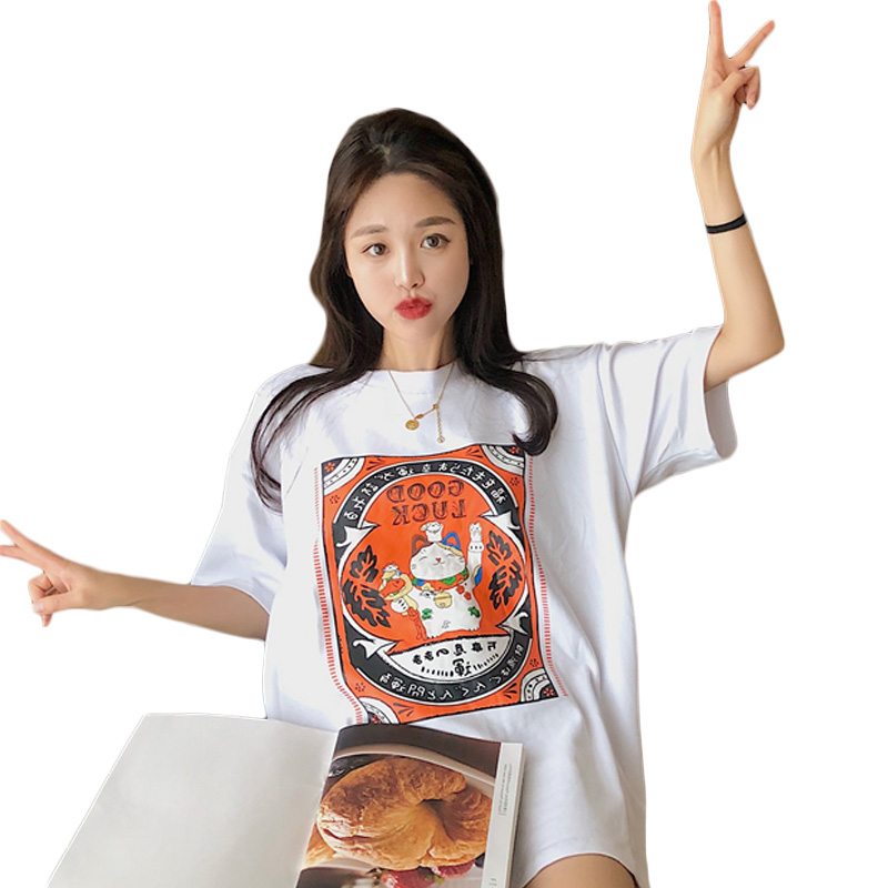 Summer white Merchants Cat Printed Pure Cotton Short Sleeve T-shirt Woman Loose Korean version for long version 100 hitch headblouse