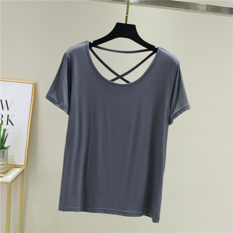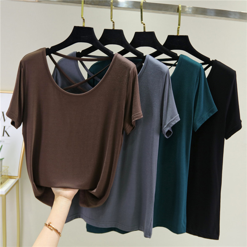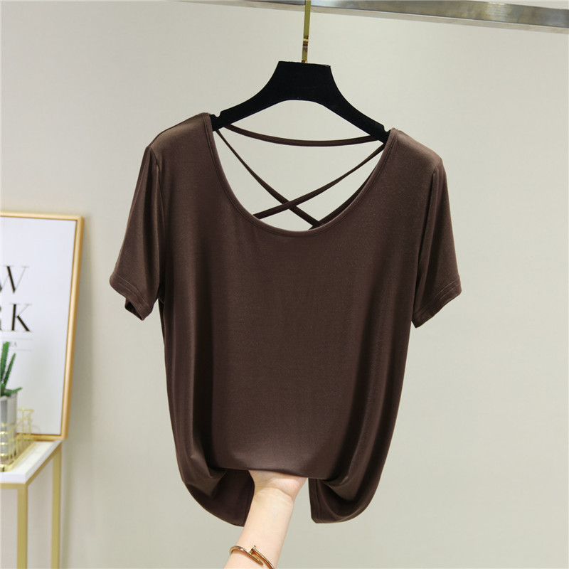 Round neck Korean T-shirt women's thin section leak back net red modal sexy loose isn thin solid color short-sleeved bottoming shirt