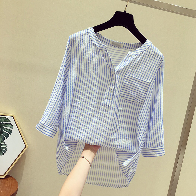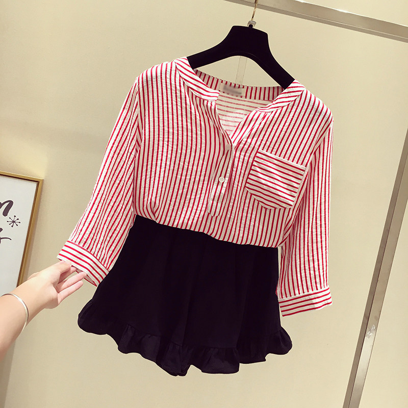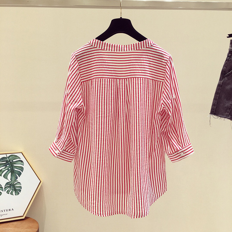 Brand Discount Store Women's Clothing Cut Mark Clear Bin Spring Summer V Collar 70% Sleeves Red Striped Snow Spinning Shirt Woman Autumn