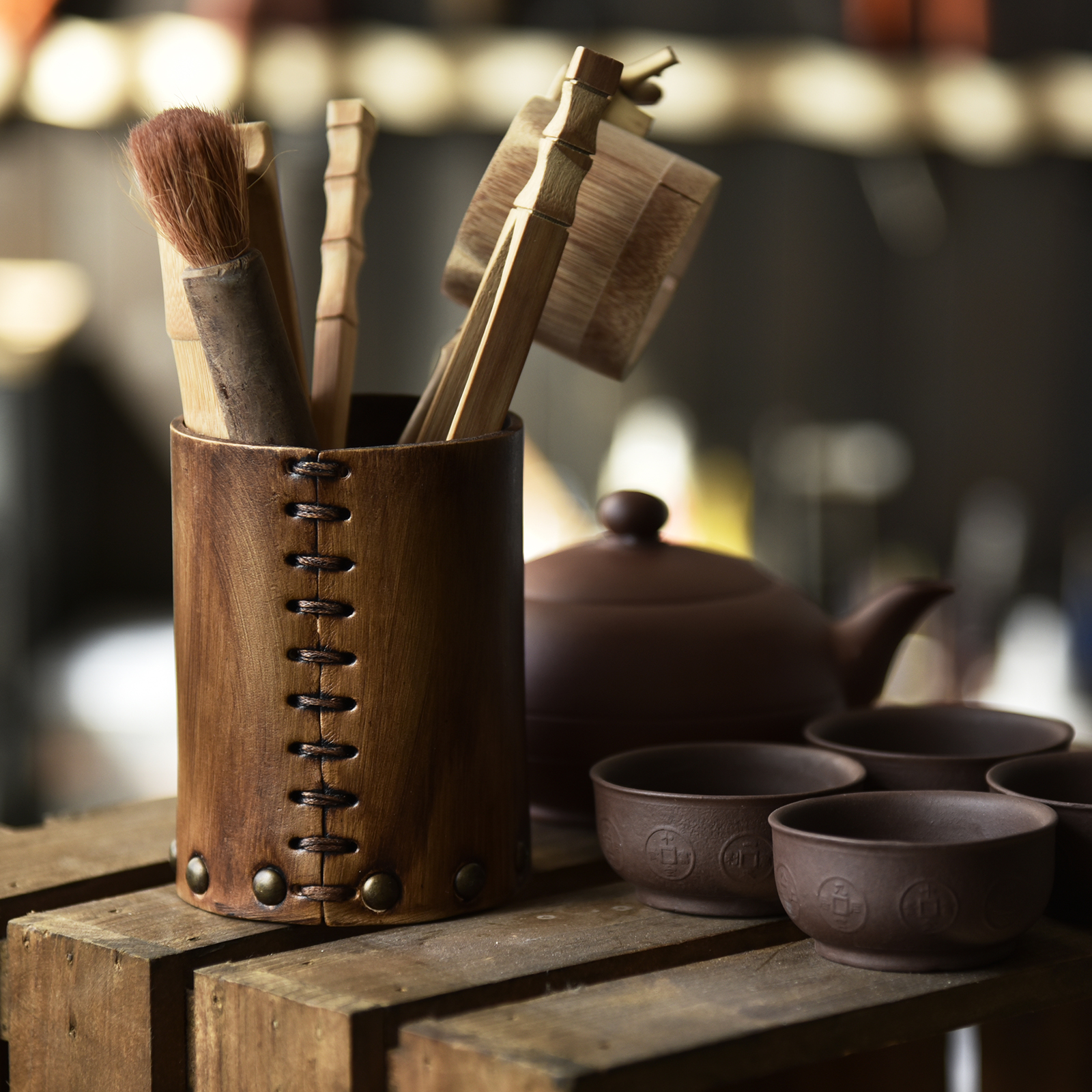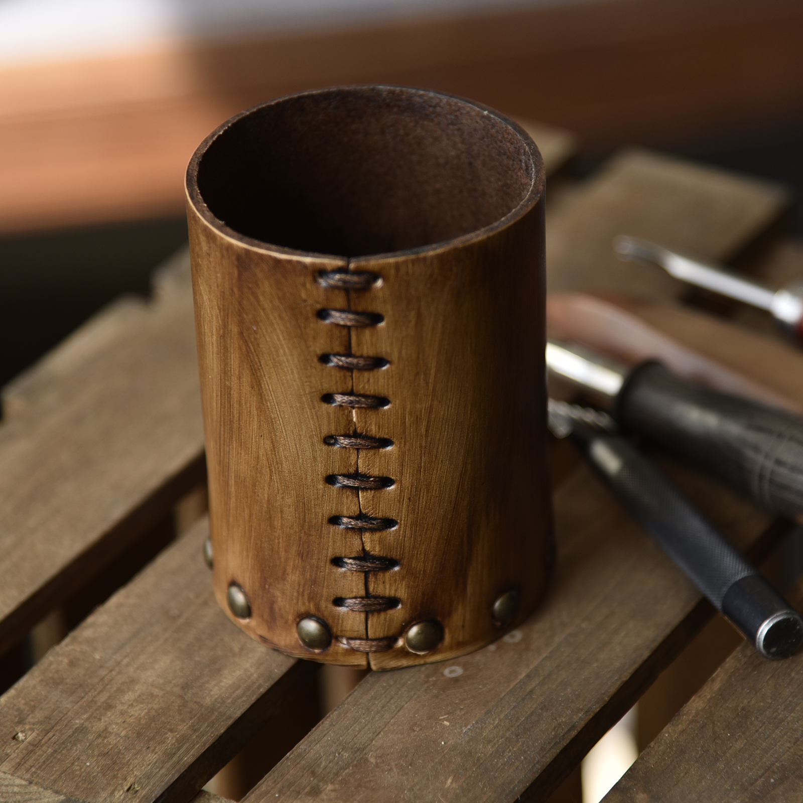 Handmade vegetable tanned cowhide pen holder desk study creative pen bucket student desktop decoration stationery storage tube retro