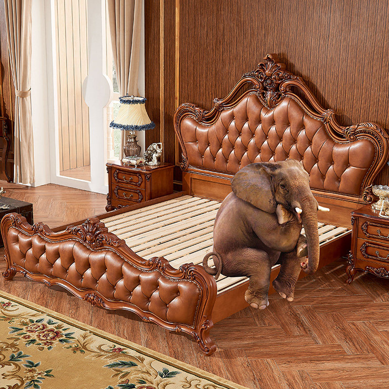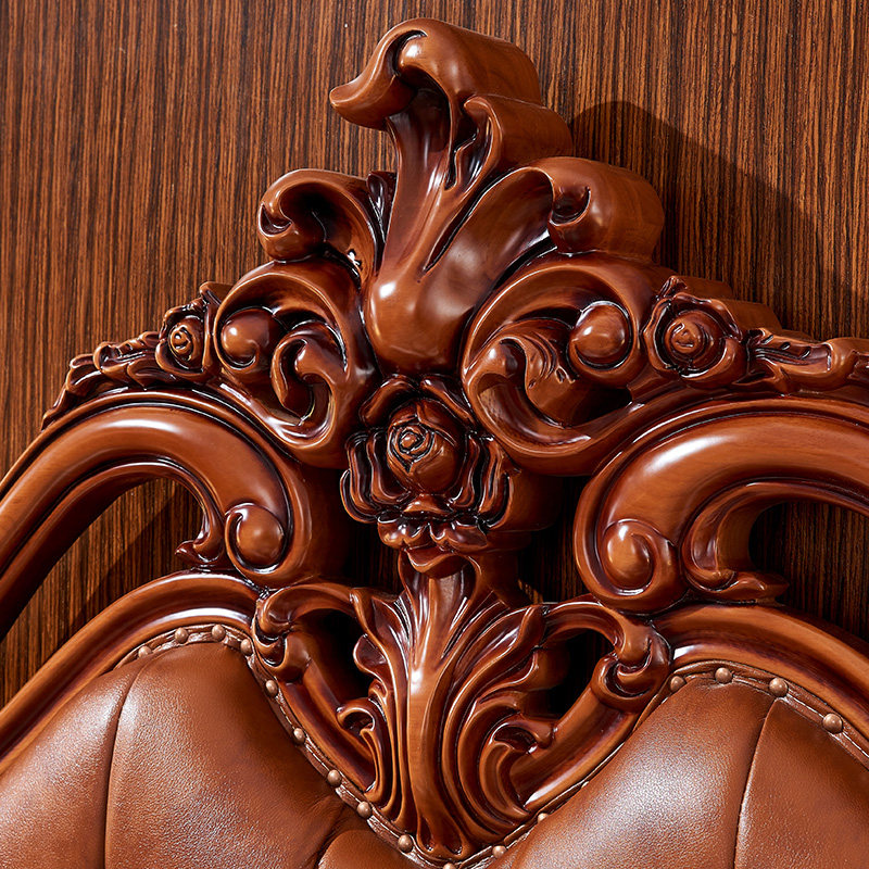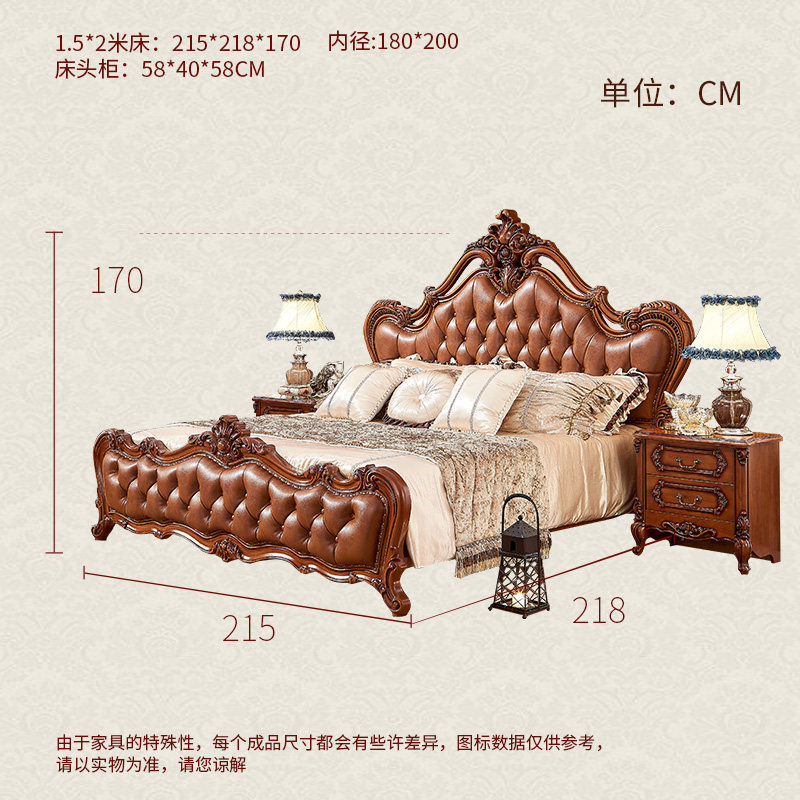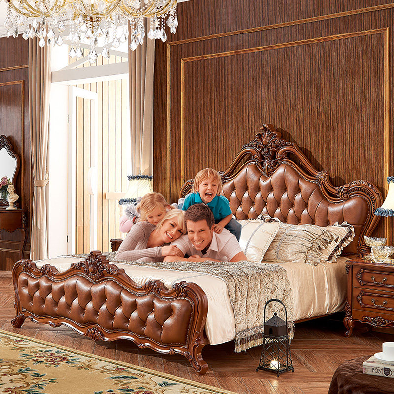And home European-style solid wood genuine leather Flowers Double Main Bed American 1 8 m Head Layer Cow Leather Oak Soft-covered Wedding Bed