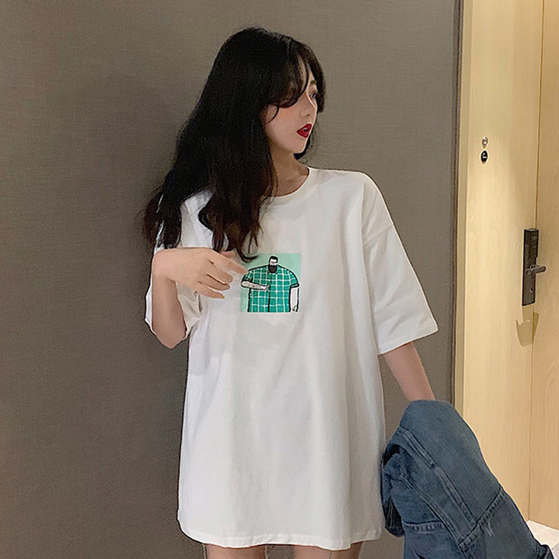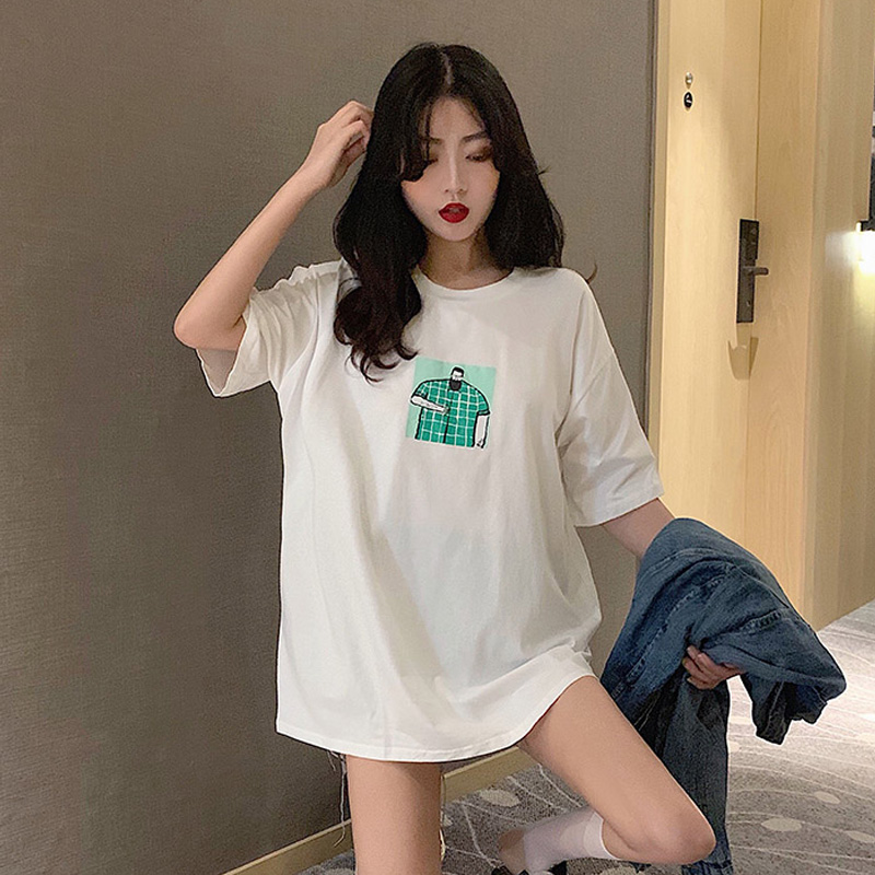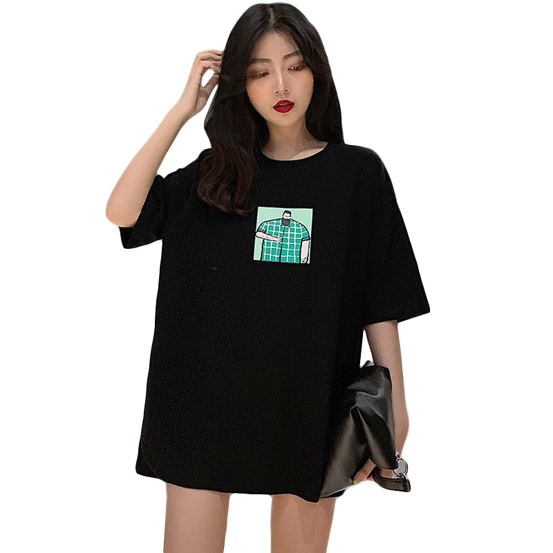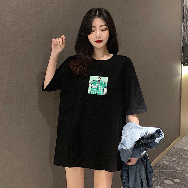 Large size black short sleeve women's net red cotton T-shirt ins exceeds medium and long version Joker printed half sleeve jacket summer tide