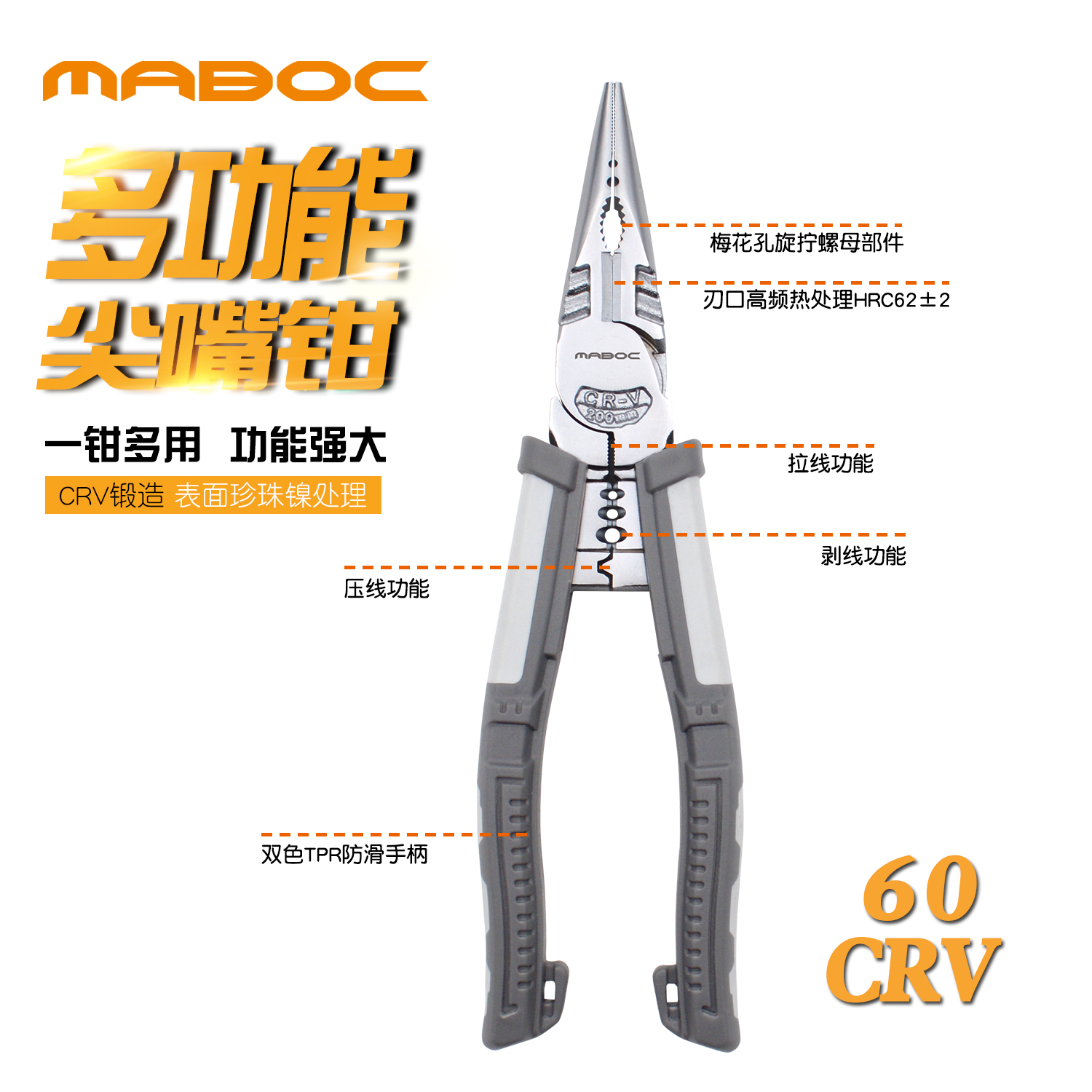 MABOC vise multifunctional universal 8 inch pointed nose pliers Household wire stripper wire pliers Chromium vanadium alloy steel
