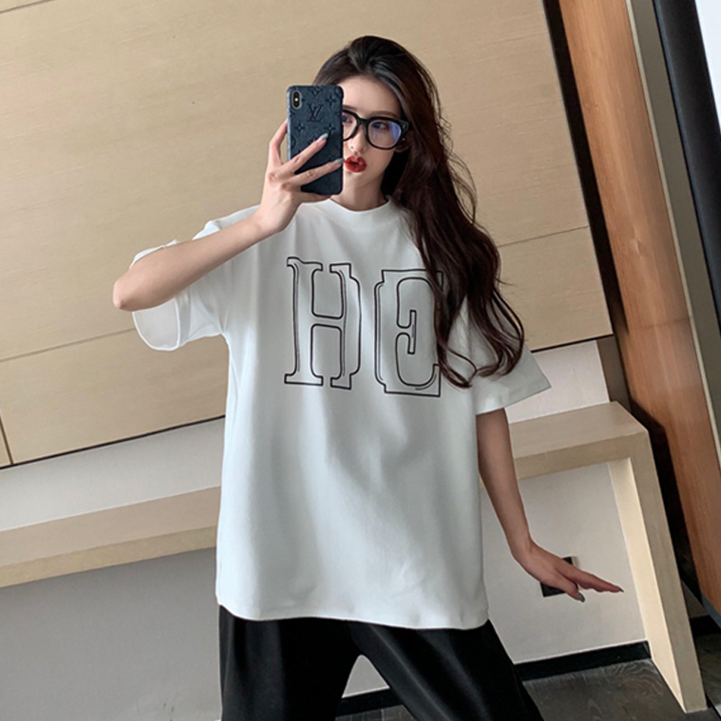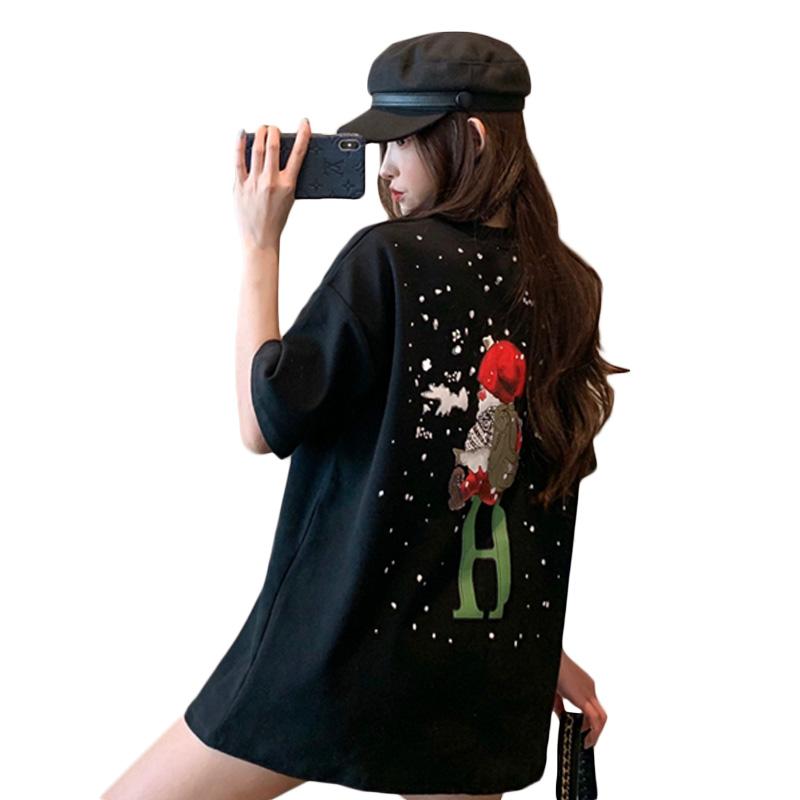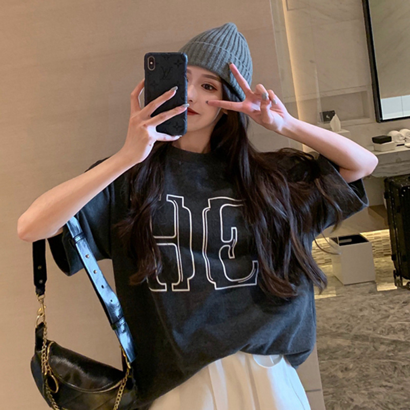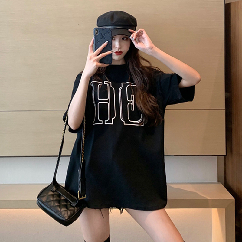 Black short sleeve T-shirt woman 2020 Summer new ins Chaozy Lazy Print Medium Long Version Blouse Big Size Clothes