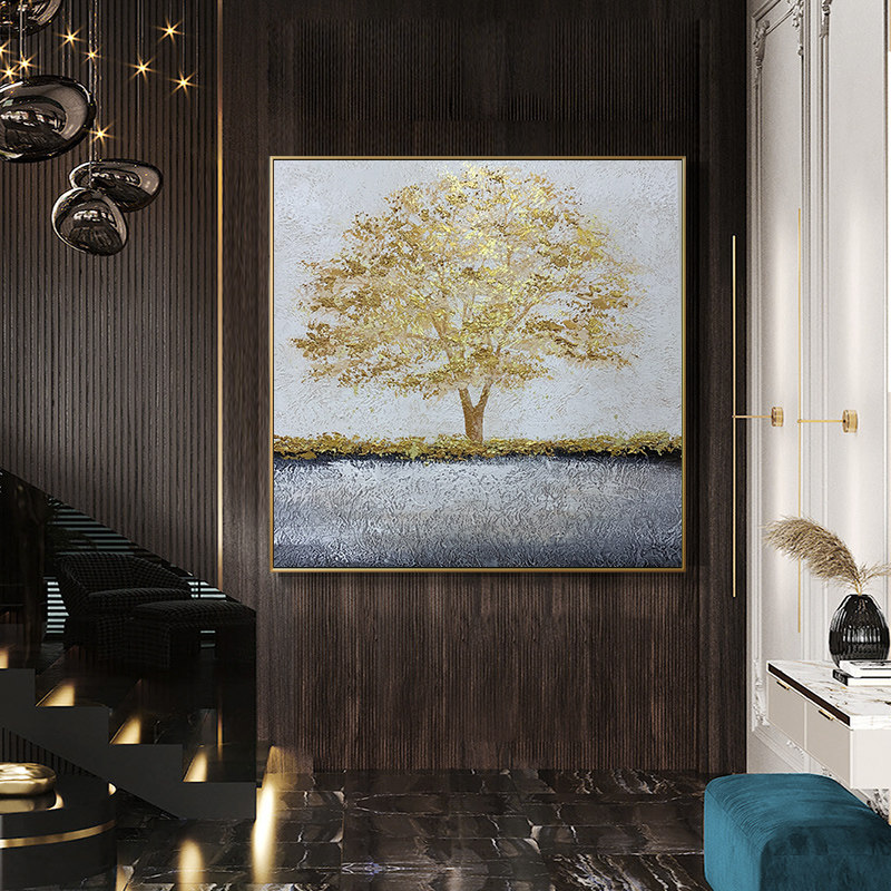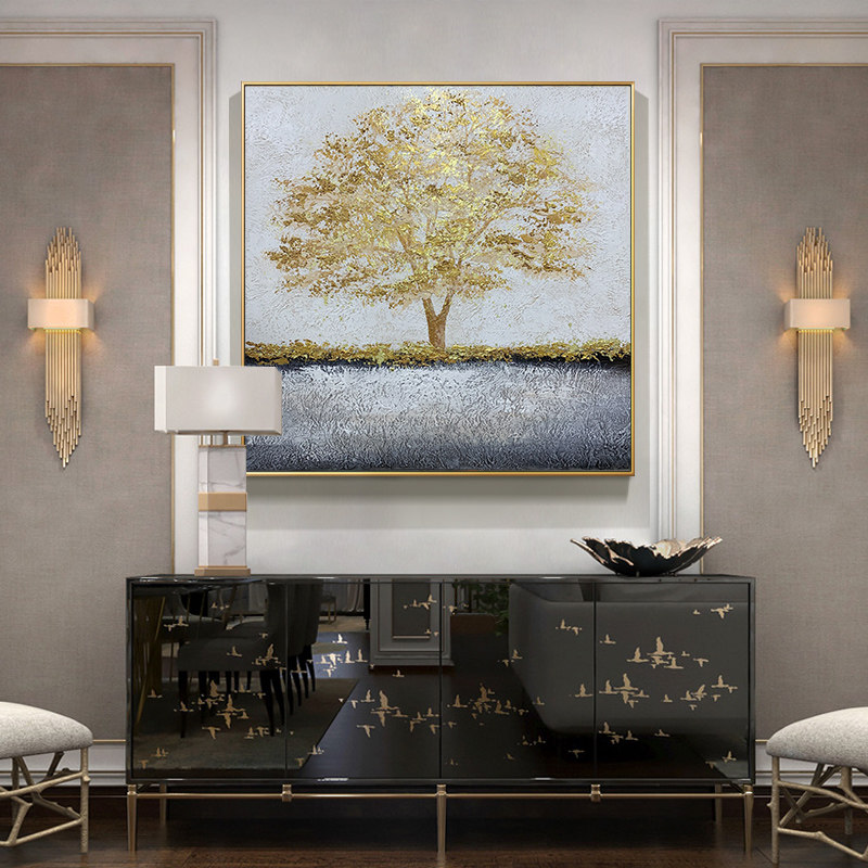 Pure hand-painted oil painting home entrance hanging painting golden fortune tree decorative painting Fantasy square fresco light luxury gold leaf painting