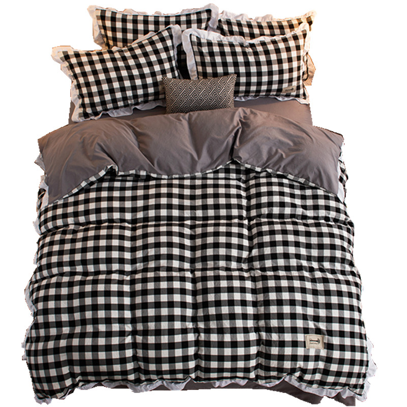 ins Korean version of yarn-dyed washed cotton four-piece striped plaid quilt cover princess style lace bed sheet net red 1 8