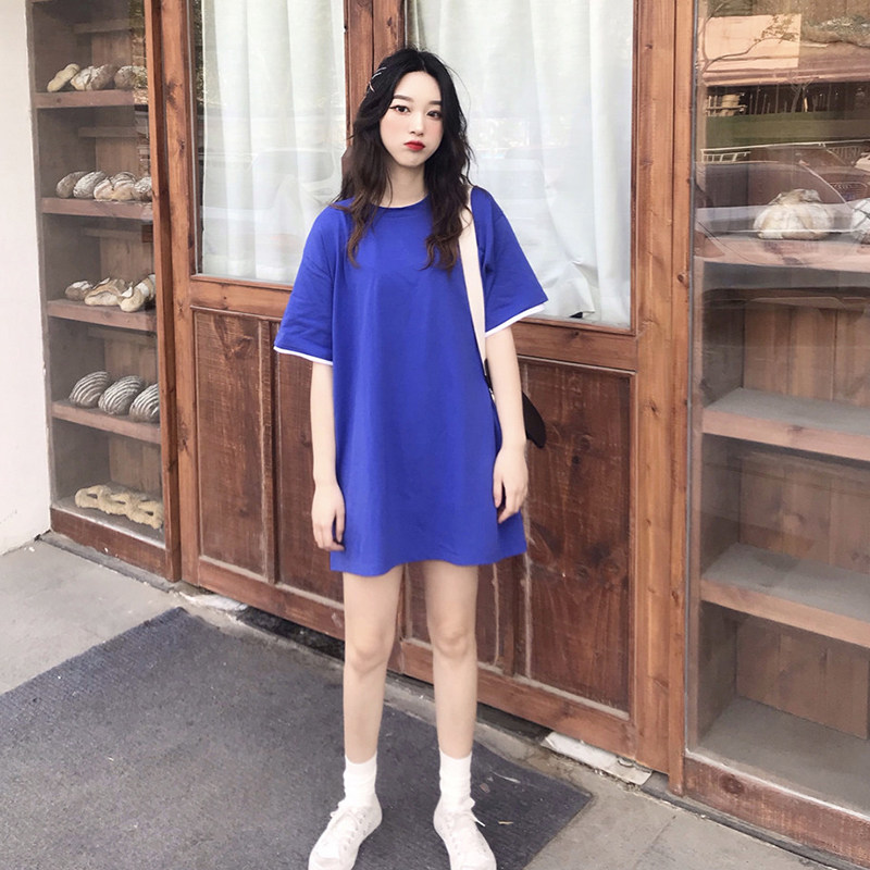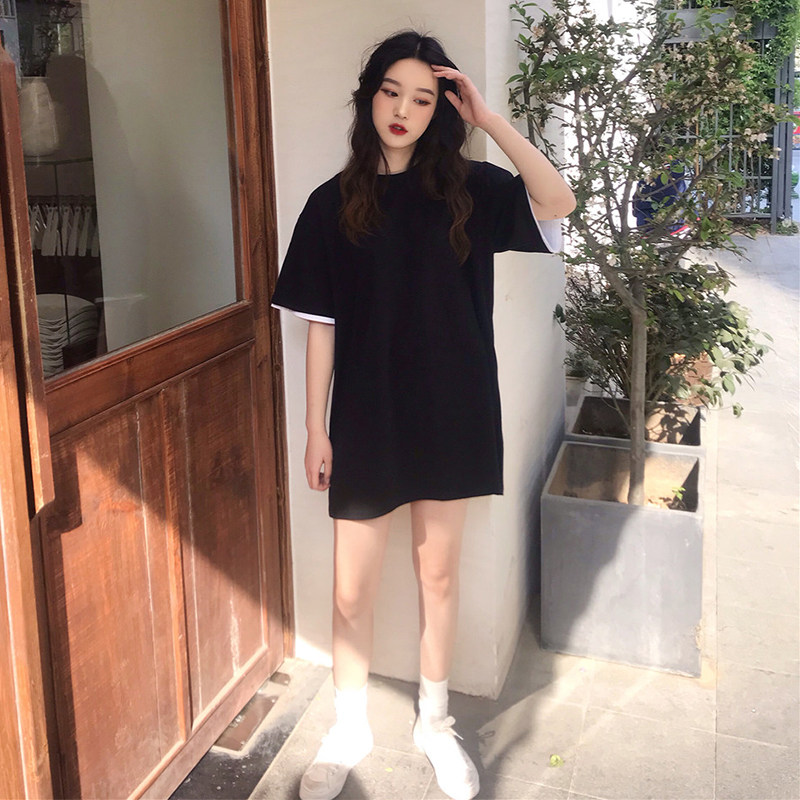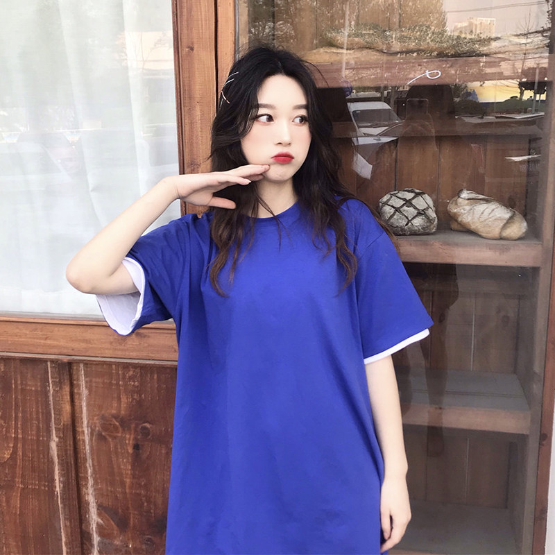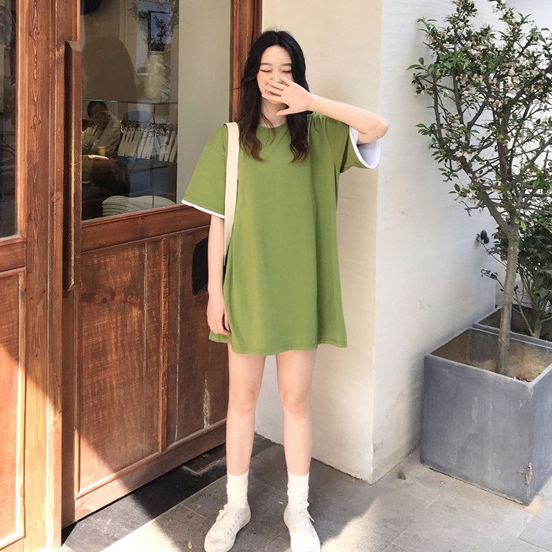 Short Sleeve T-Shirt Woman Loose Korean version 2022 Summer New Bull Oil Fruits Green Fake two pure color medium long version T-shirt tide