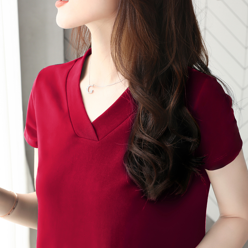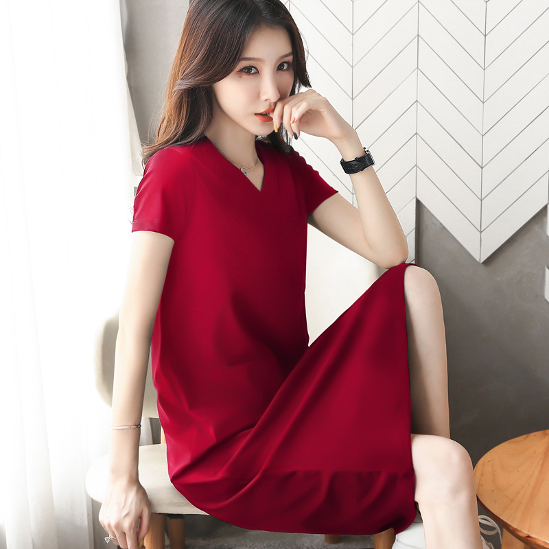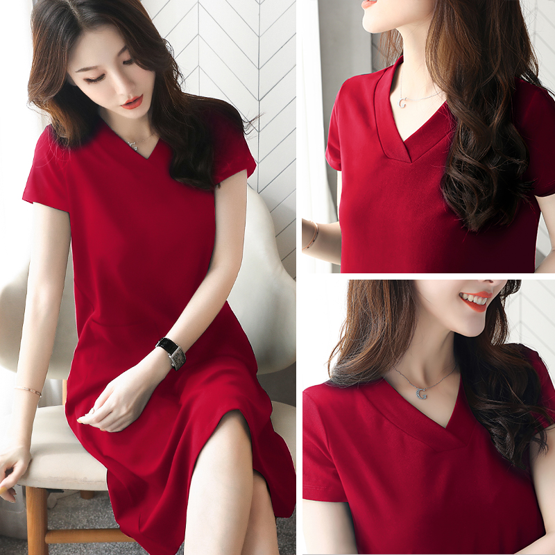 Red Temperament Ocean Dress Spring Summer Goddess Van Dress V Collar Large Size Weight Slim Fit Slim Fit Slim Short Sleeve Long Version Skirt