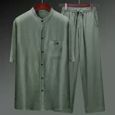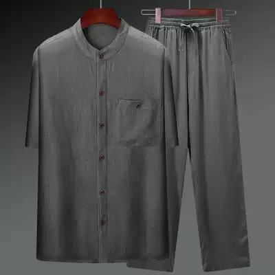 Cotton linen Tang suit men's summer thin short sleeve shirt Chinese style retro linen set elderly dad men's