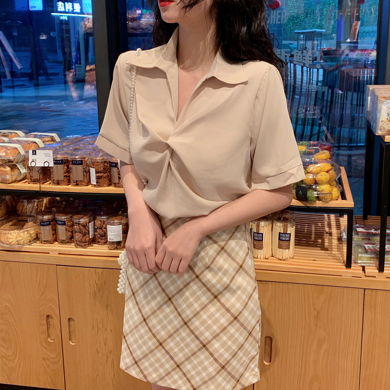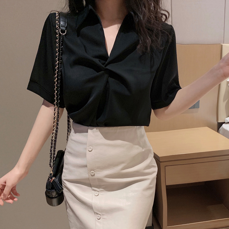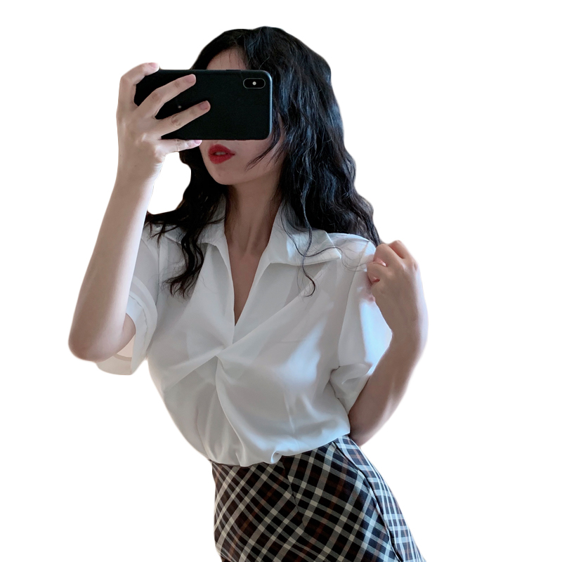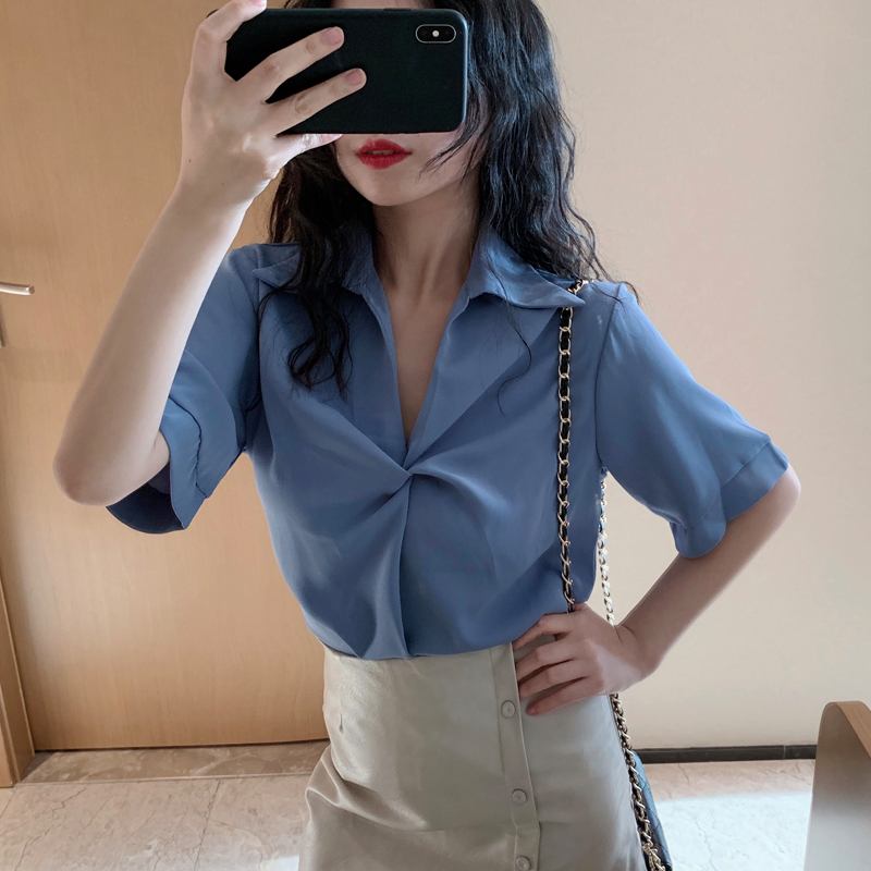 Large size shirt women's V-neck cross fashion foreign style shirt loose design niche short sleeve chiffon shirt top summer