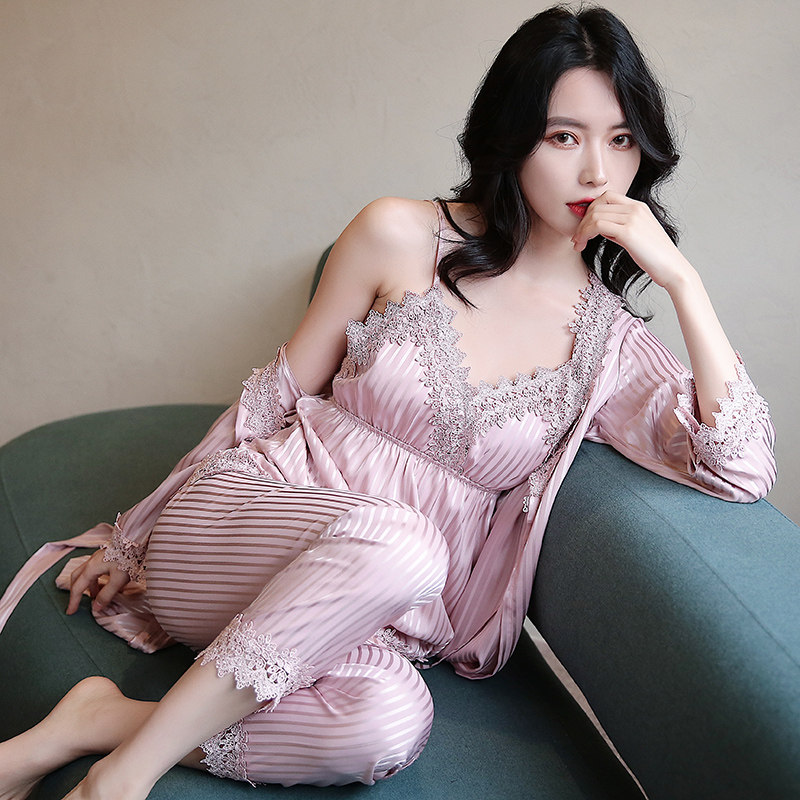 Spring Autumn Pyjamas Woman Sensation Harness Four Pieces Of Silk Long Sleeve Ice Silk Summer New Thin Style Sleeping Dress Sleeping Robe Suit