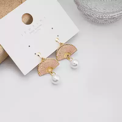 Creative antique retro fan Pearl tassel earrings plum blossom folding fan cute oil ear needle without ear hole ear clip female