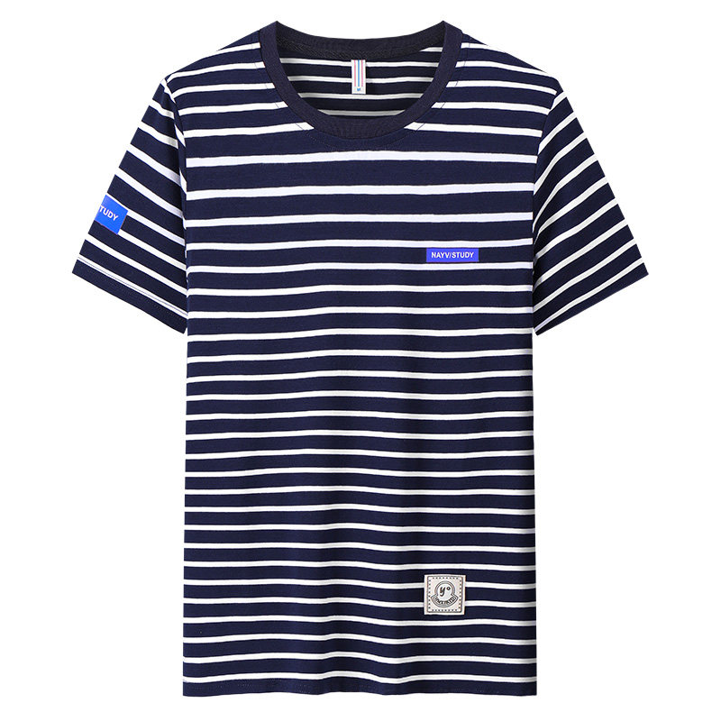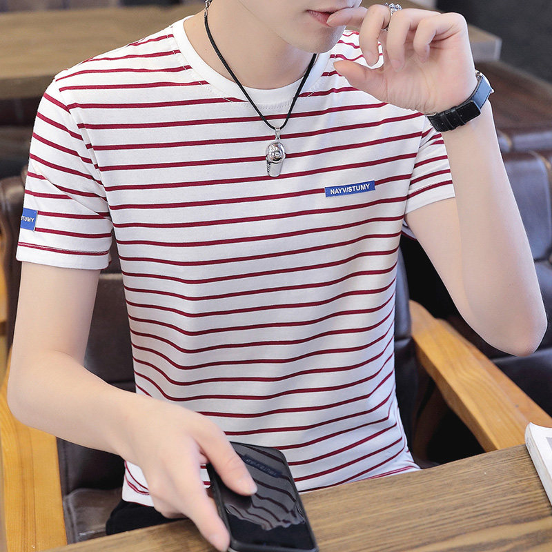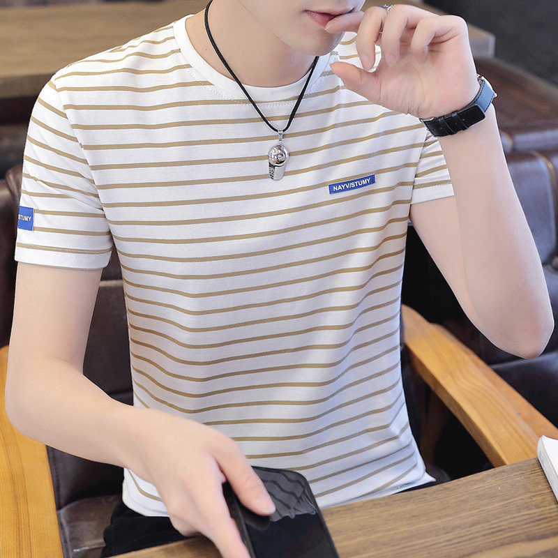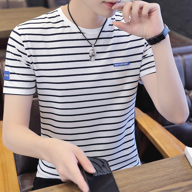 Striped short-sleeved t-shirt men's pure cotton summer Korean version 2021 trend new round neck half-sleeved men's t-shirt top clothes
