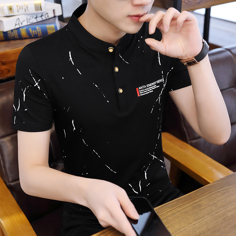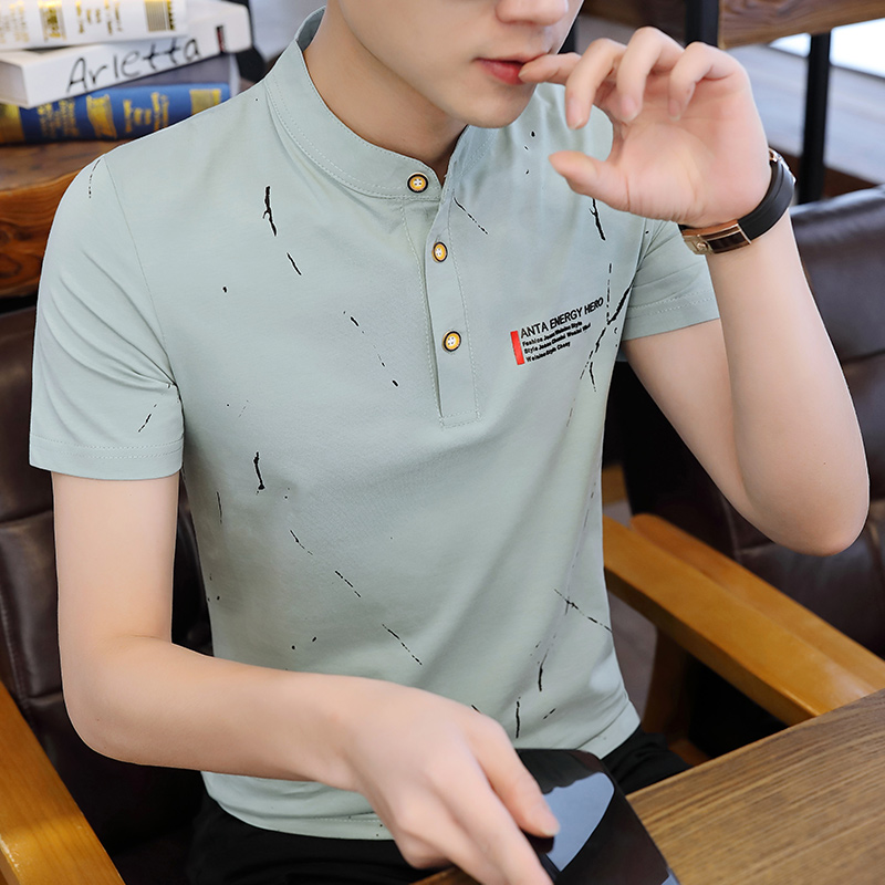 2020 summer small stand-up collar t-shirt men's short sleeve Korean version of the trend slim ink pure cotton half turtleneck half sleeve t-shirt