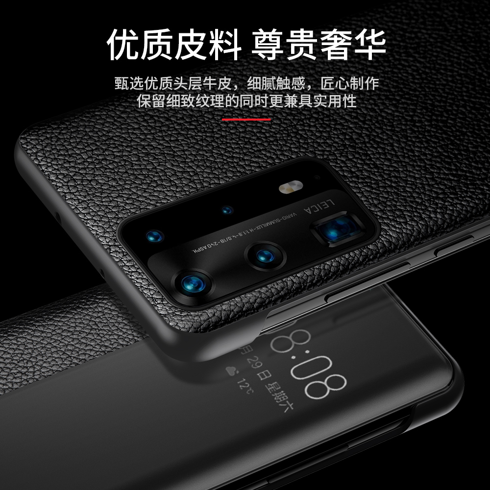 Suitable for Huawei p40 mobile phone protective shell p40pro plain leather protective cover 40pro pe leather top layer cowhide smart flip-up leather case 5g anti-fall high-end business men's limited edition