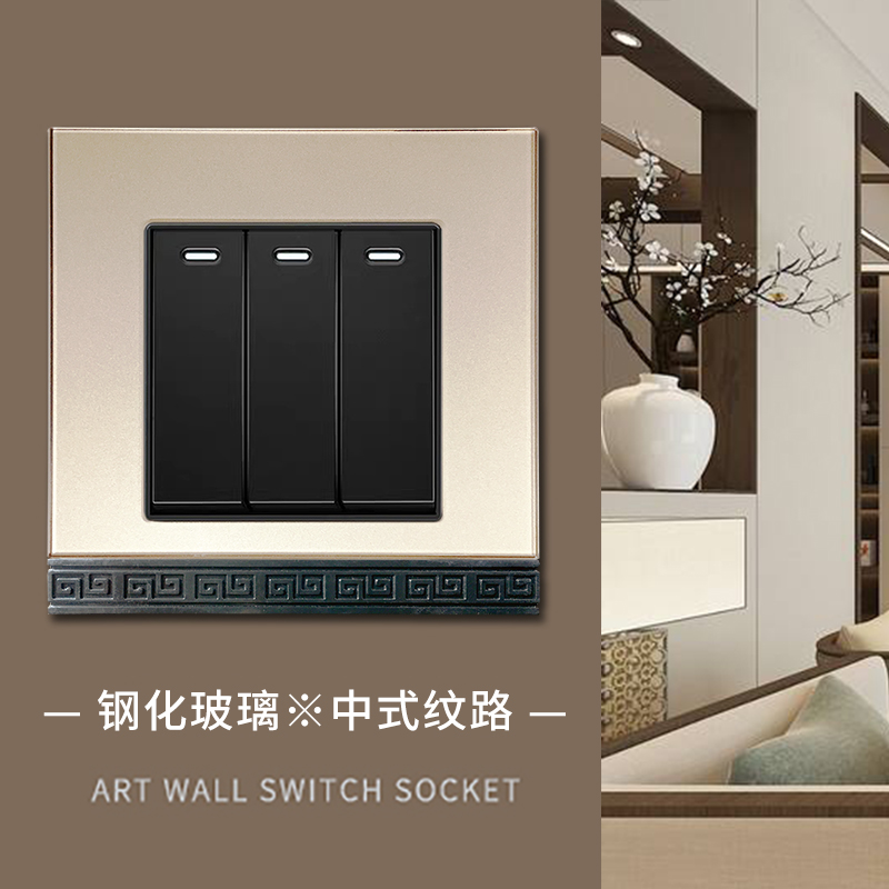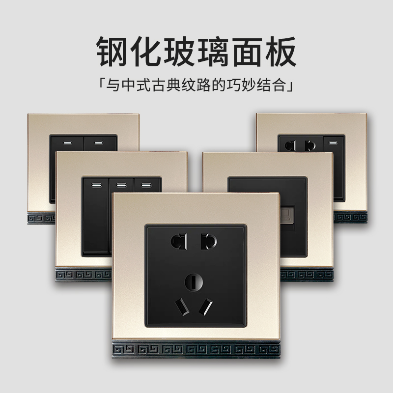 Pudiva 86 champagne gold tempered glass wall five-hole socket usb new Chinese switch panel home