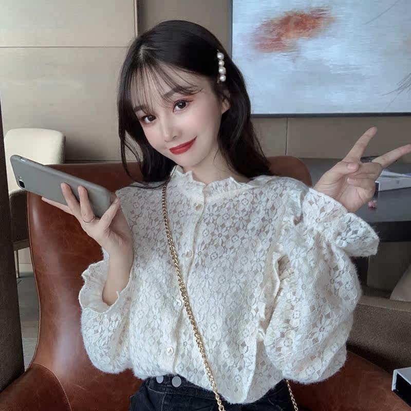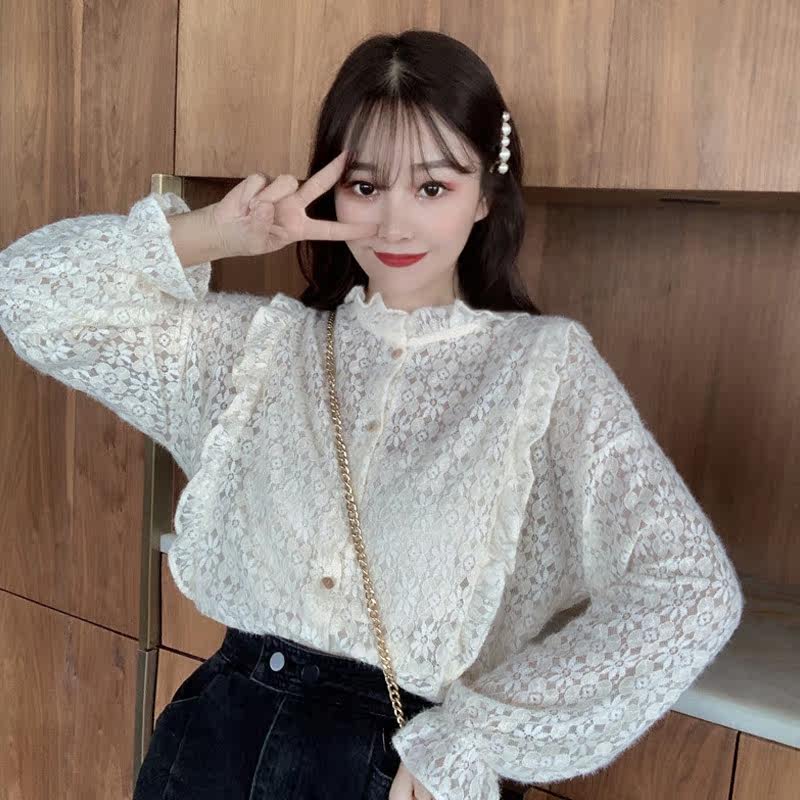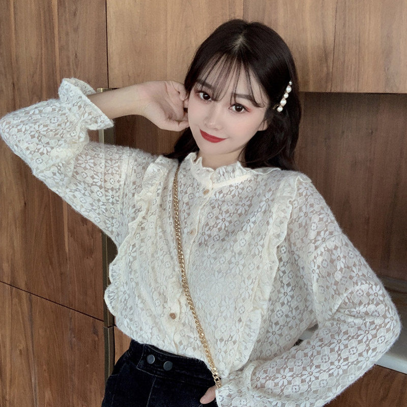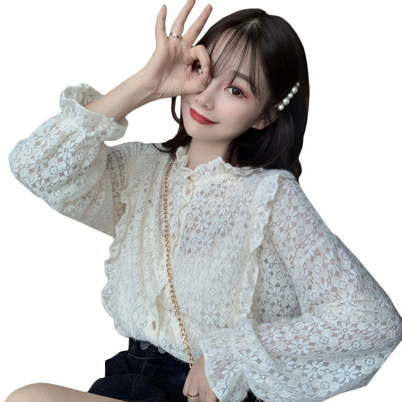 Large size shirt women's retro Hong Kong style design sense niche sexy fungus edge mesh chiffon shirt long-sleeved shirt spring and summer