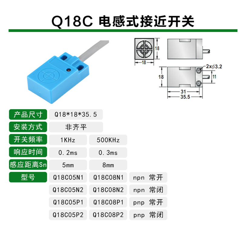 Q18C inductance type flat square proximity switch sensing distance 5mm 8mm third-line npn often open and close direct current