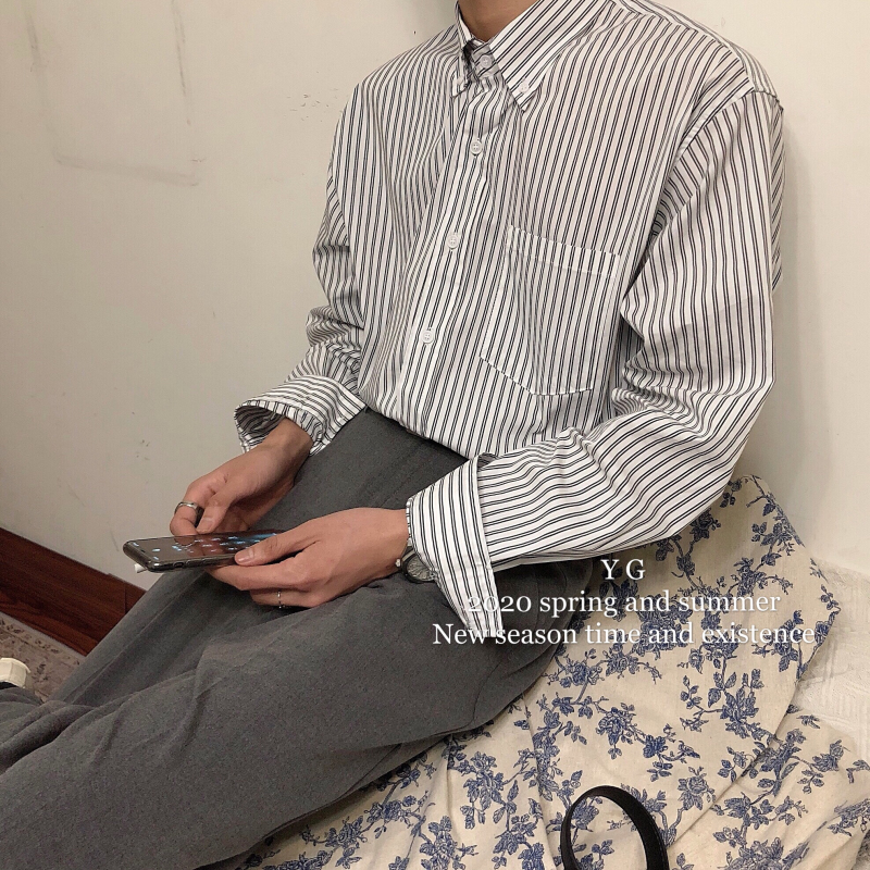 yghome shirt men's long-sleeved Korean version loose all-match retro Hong Kong style blue striped shirt jacket men's and women's tide