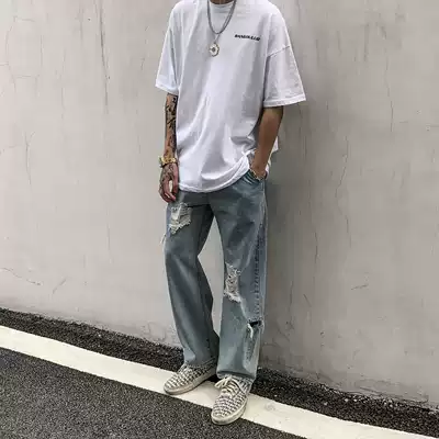Autumn and winter High Street straight tube retro old broken hole jeans light color washing wide leg loose knife cut old father pants men's tide