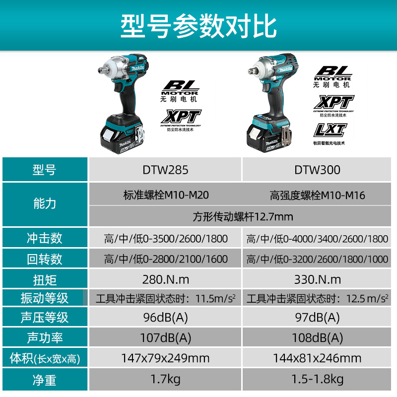 The following is DTW285, 1 2 square head, torque 280NM DTW285 bare metal no battery no charger DTW285 single electric standard charging 3.0 battery standard matching meal TW285 dual electric fast charging 3.0 battery standard matching meal DTW285 single electric standard charging 4.0 battery standard meal DTW285 dual electric fast charging 4.0 battery sleeve package DTW285 single electric standard charging 5.0 battery standard matching meal DTW285 double electric fast charging 5.0 battery sleeve package DTW285 Single Electric Meter Charge 6.0 Battery Standard Package DTW285 Dual Electric Fast Charge 6.0 Battery Sleeve Package The following is the latest DTW300, 1 2 square head, torque 330M DTW300 bare metal no battery no charger DTW300 single electric meter charge 3.0 battery standard matching meal DTW300 double electric fast charge 3.0 battery sleeve package DTW300 single electric charge 4.0 battery standard matching meal DTW300 double electric fast charge 4.0 battery sleeve package DTW300 Single Electric Meter Charging 5.0 Battery Standard Package DTW300 Dual Electric Fast Charging 5.0 Battery Sleeve Package DTW300 Single Electric Meter Charging 6.0 Battery Standard Matching Meal DTW300 Dual Electric Fast Charging 6.0 Battery Sleeve Package