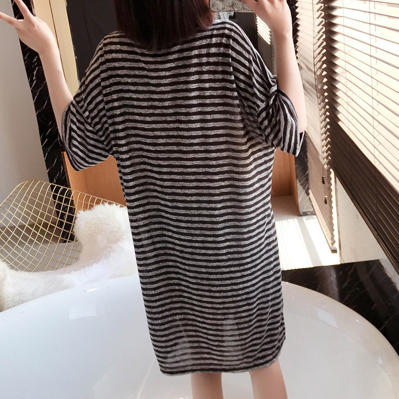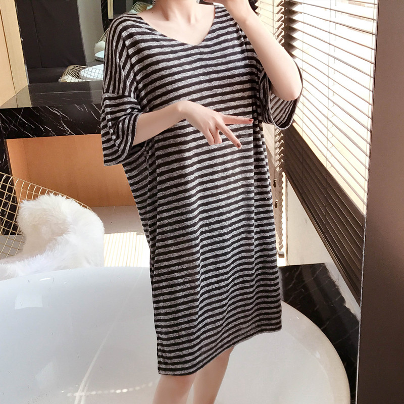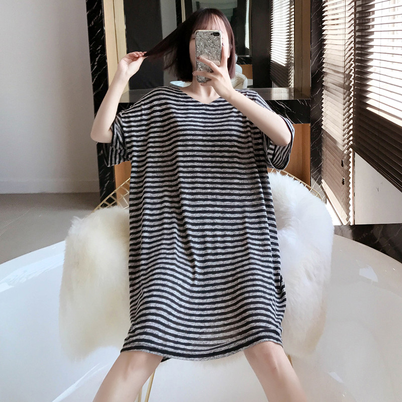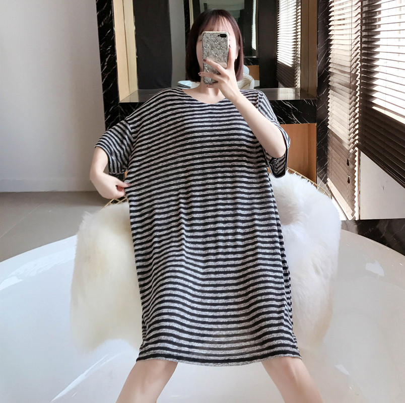 Nightdress women's summer fat mm plus fat plus size short-sleeved thin pajamas women's 200 catties striped ins loose can be worn outside