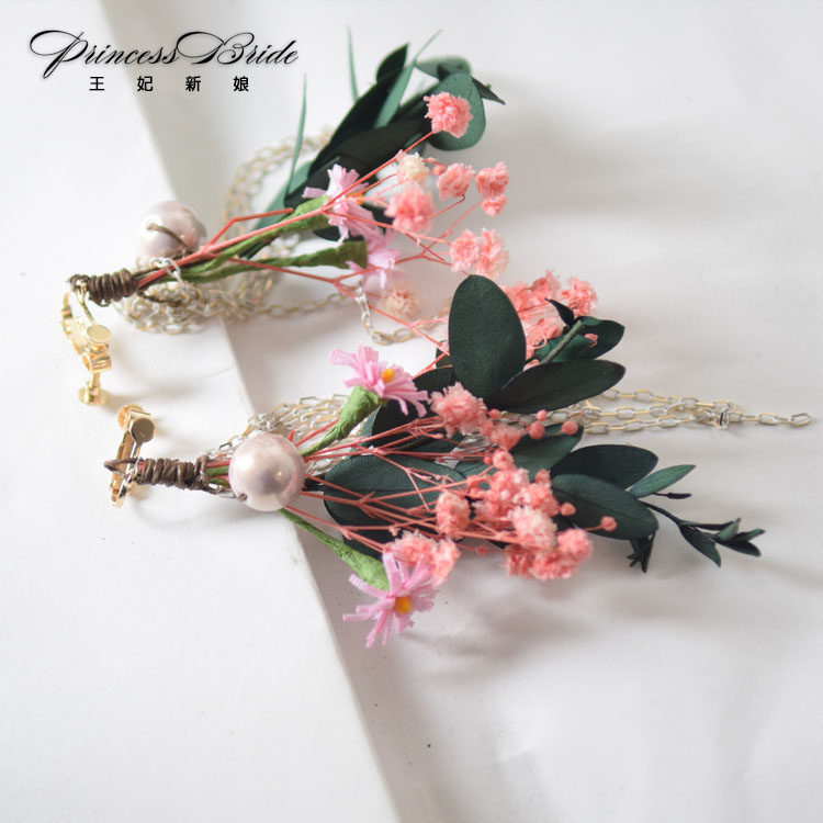 Princess's new pink dried flower princess head flower hair fork earrings bride wedding Korean styled Brigade slapped wedding dress headwear