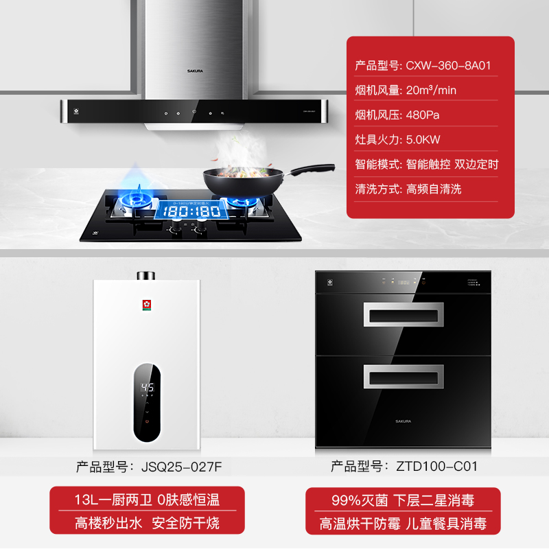 Sakura range hood stove set Smoke stove heat elimination combination kitchen three-piece range hood gas gas stove set