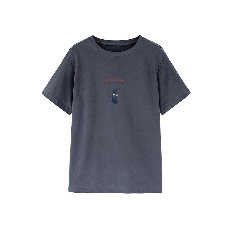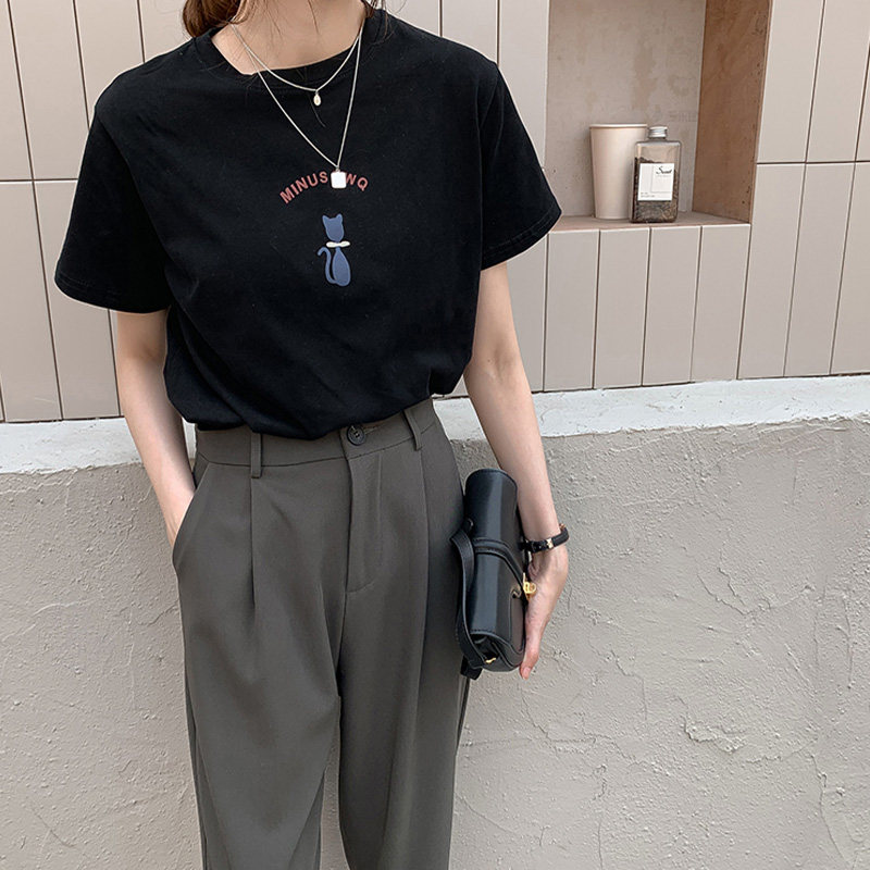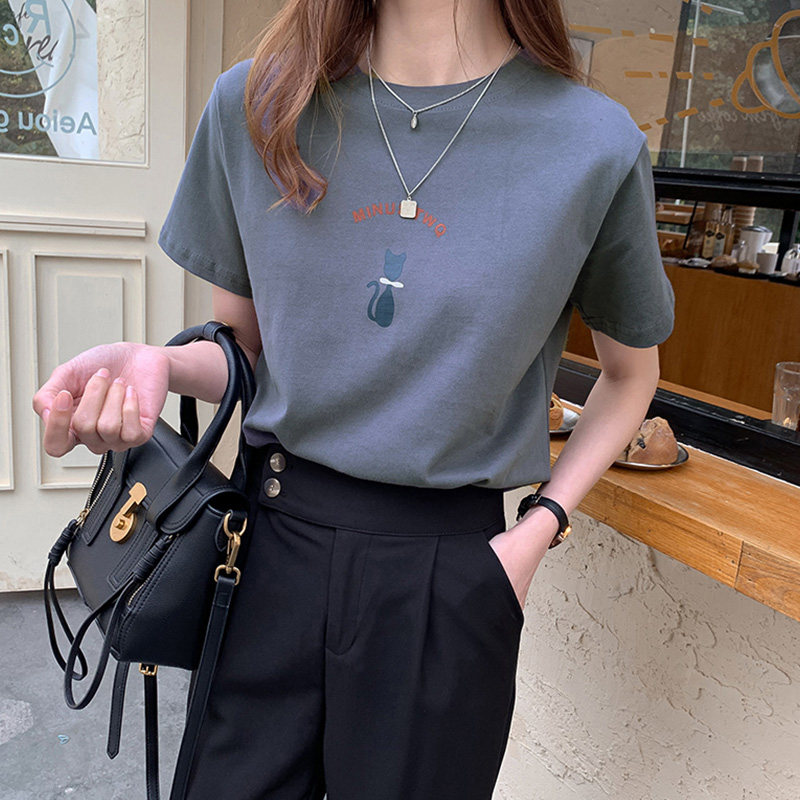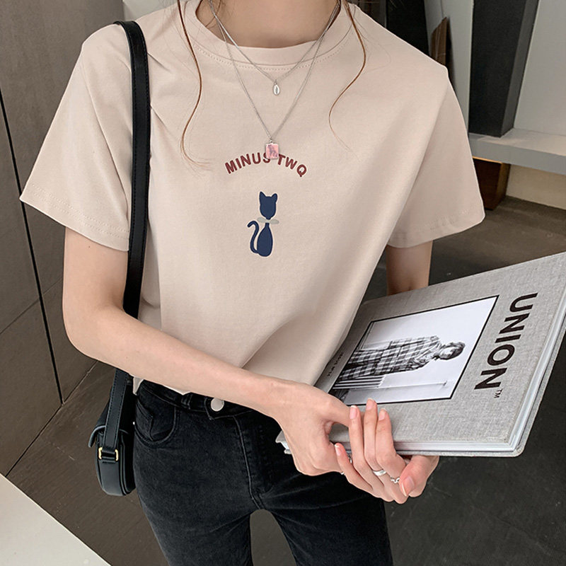 Cat printed white t - shirt women summer 2023 new temperament round - collar brief - sleeve shirt