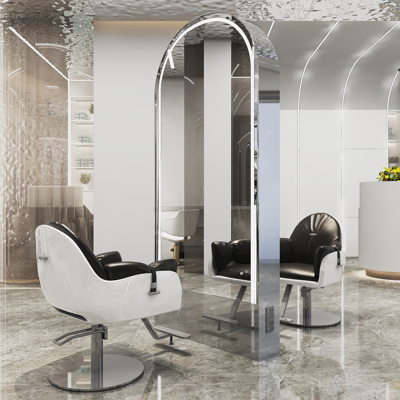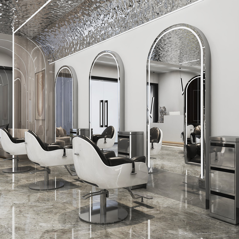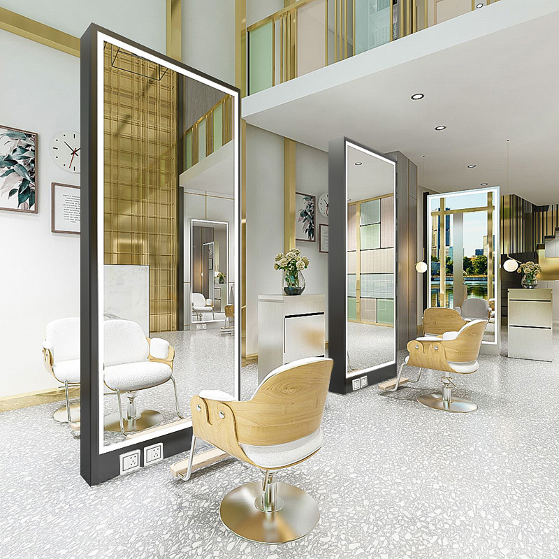 Net red single-sided light luxury hair salon hairdressing mirror simple modern hair salon special stainless steel floor mirror with lamp against the wall