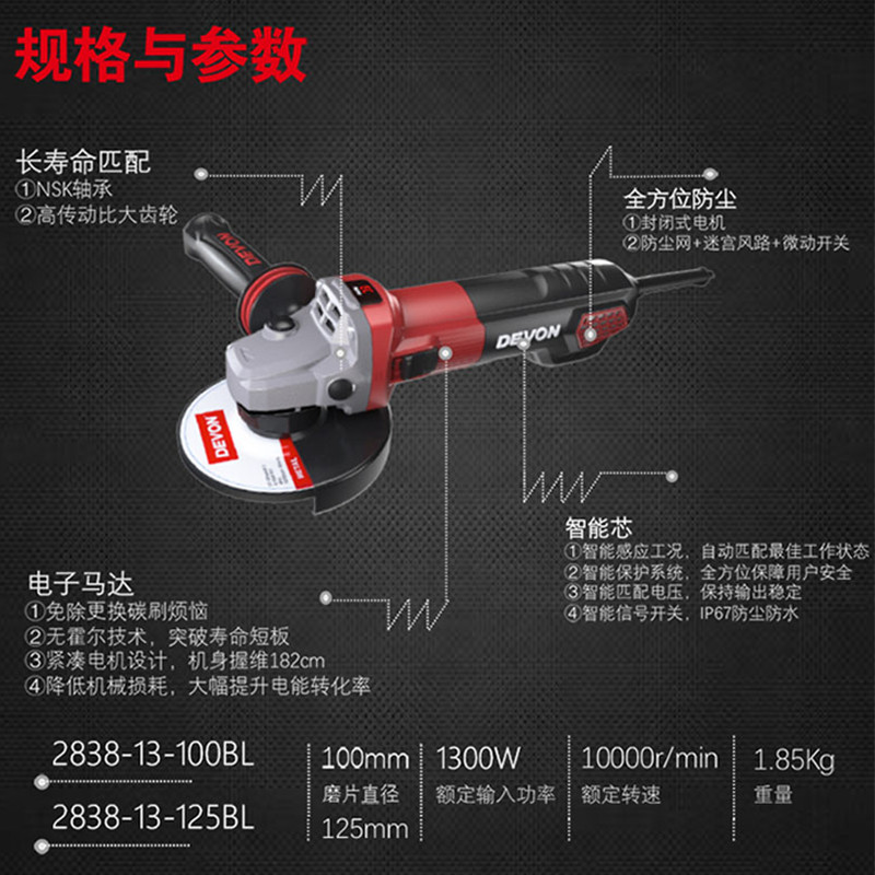 DEVON has a hand-held brushless multi-functional small angle grinder electric grinding and polishing power tool 2838