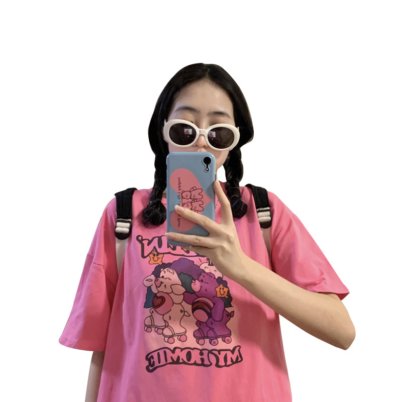 Kumiko Hara summer sweet rose pink TEE~Korean vitality girl fun cartoon printed short-sleeved T-shirt
