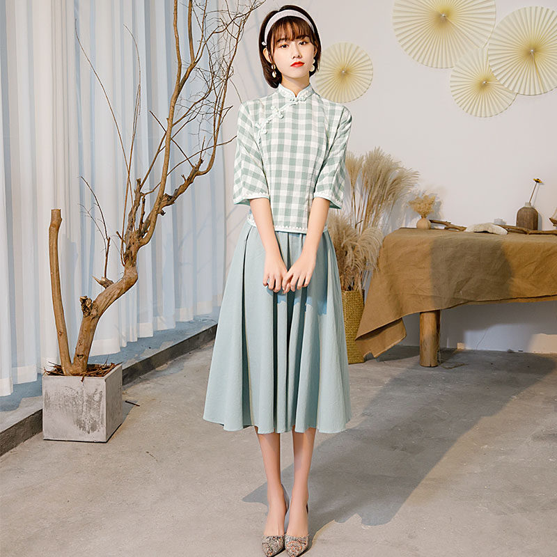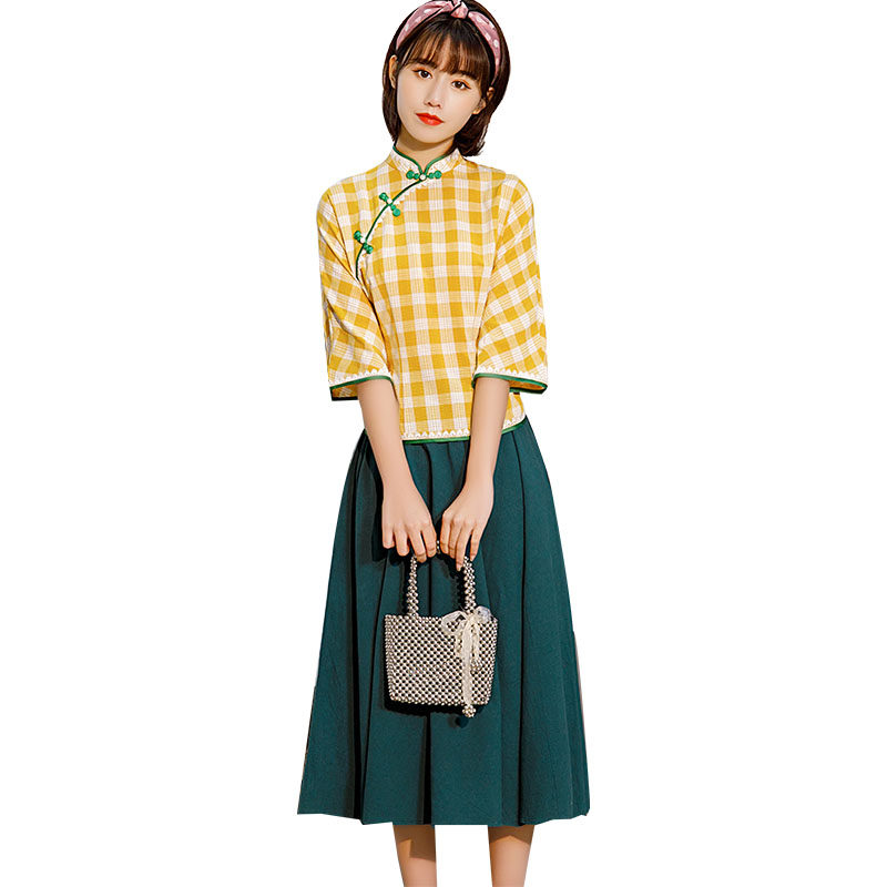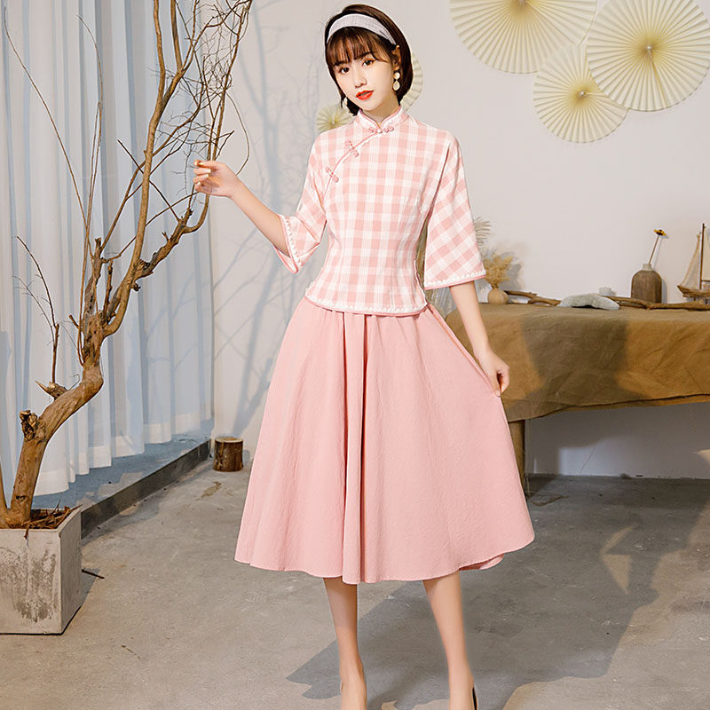 Ethnic style tang dress women's cheongsam blouse Girls Chinese style retro short sleeve modified version of the suit two-piece dress