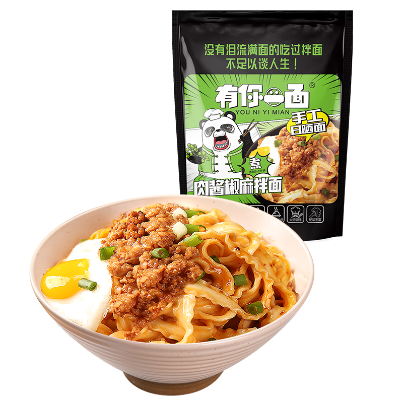 There is a quick-food noodle with meat sauce and pepper for quick-food fried noodles. Dry noodles and pasta bags are not fried.