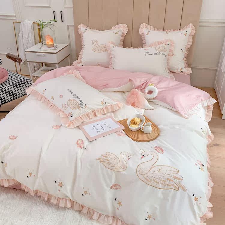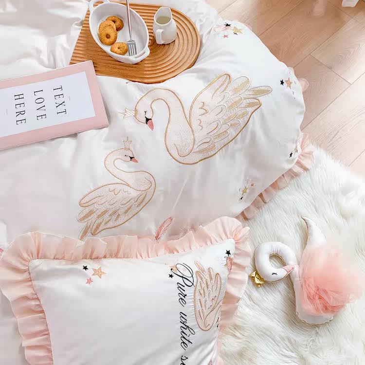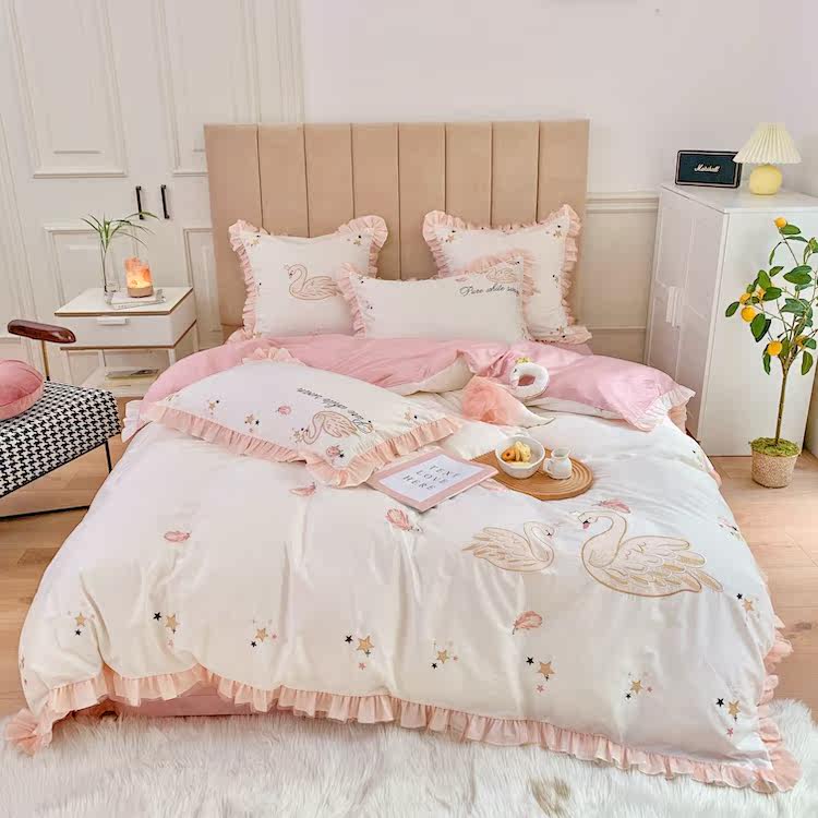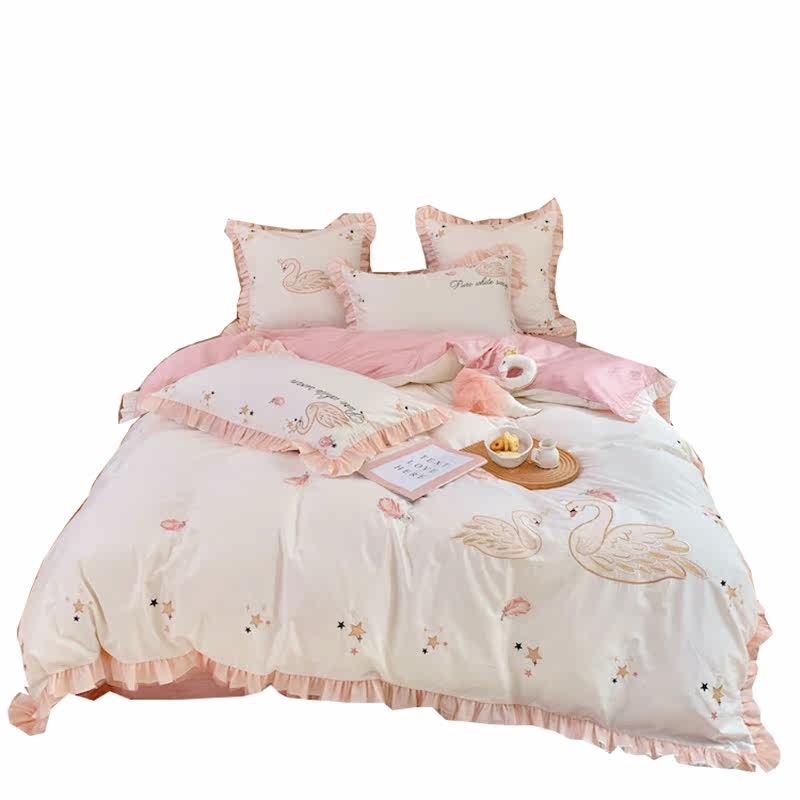 60S long staple cotton satin embroidery spring and autumn pure cotton pure cotton swan fresh sweet princess girl bed 4 pieces set