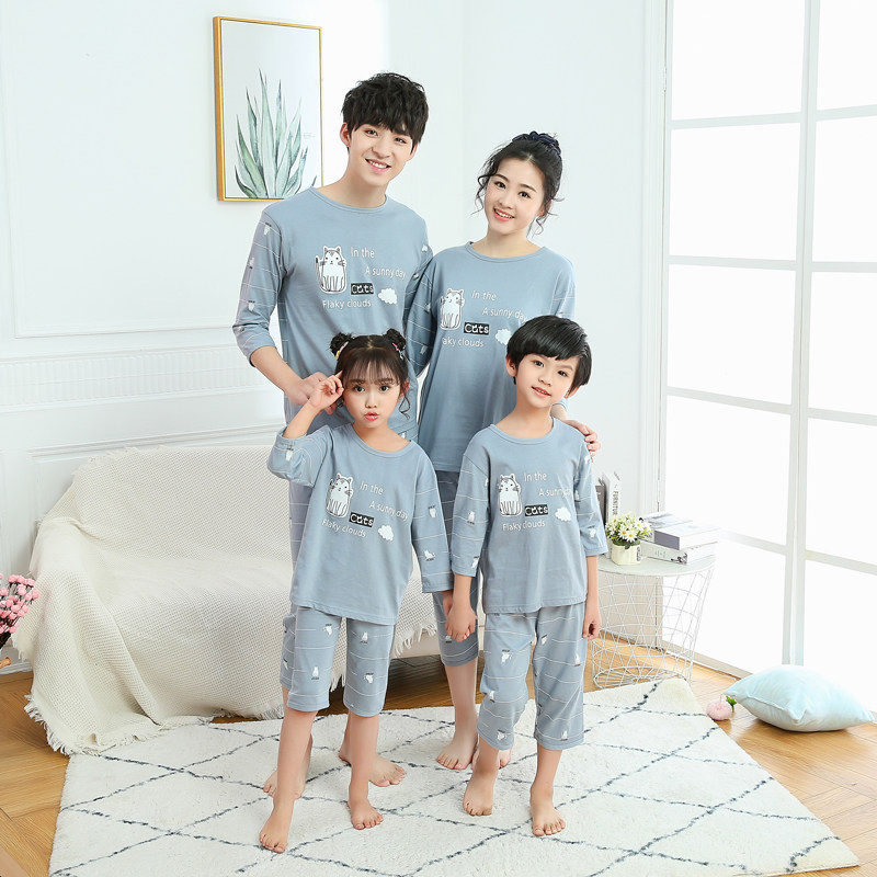 Parent-child sleepwear family of three-mouth clothing Summer men's pure cotton thin section Women's spring and autumn CUHK Tong Home Clothing Air Conditioning Suit Suit