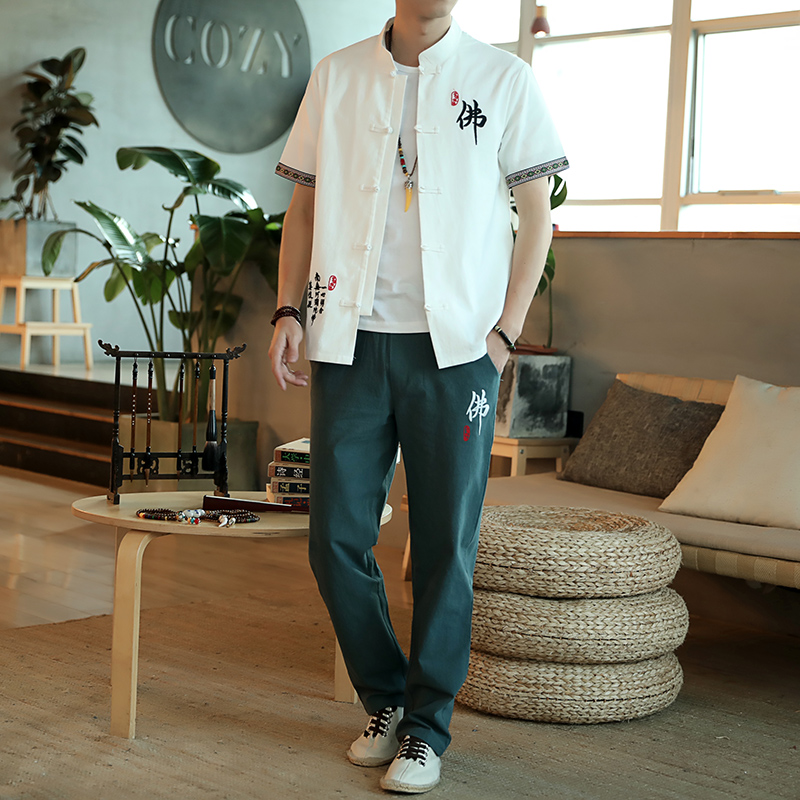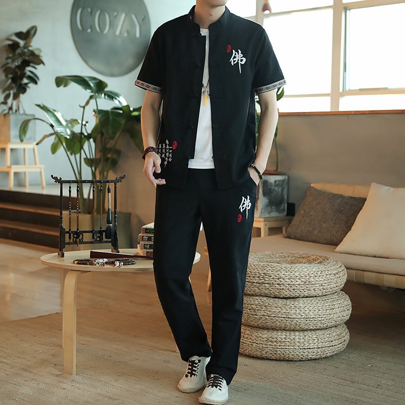 Chinese style cotton and linen suit men's large size short-sleeved t-shirt linen ancient style Tang suit pure cotton cardigan jacket stand collar set tide