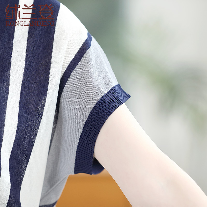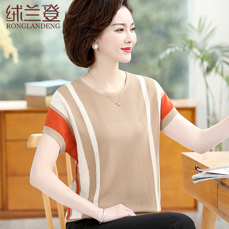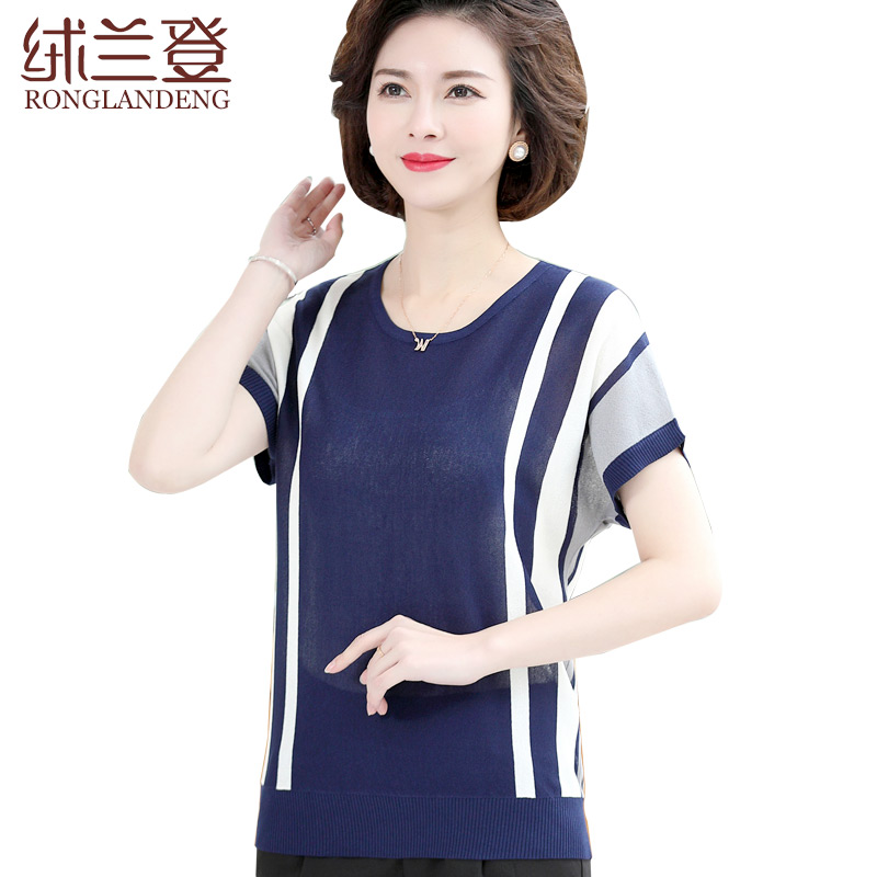Middle-aged female mother summer dress ice hemp silk knitted short-sleeved t-shirt middle-aged and elderly women summer bat sleeve top casual