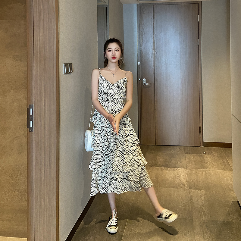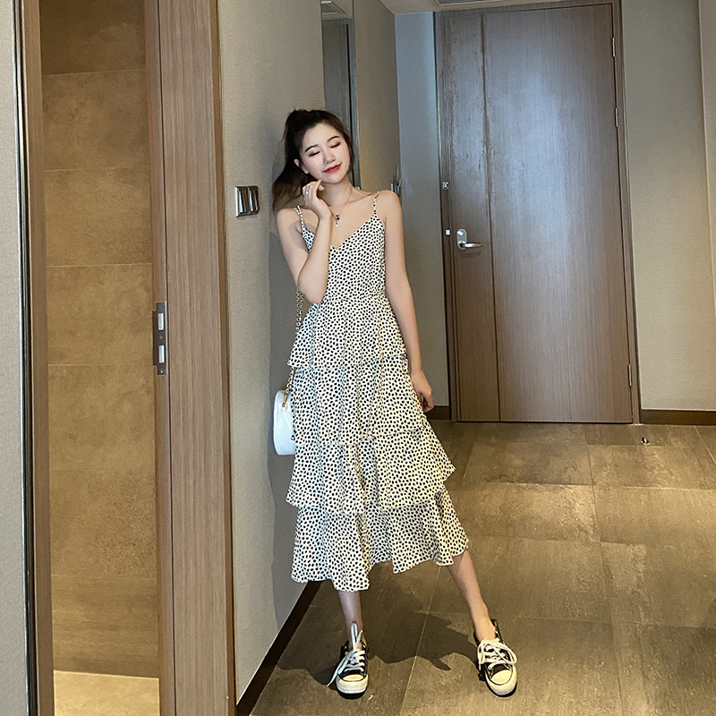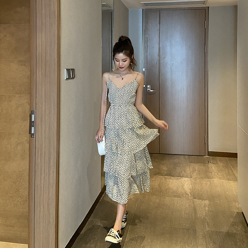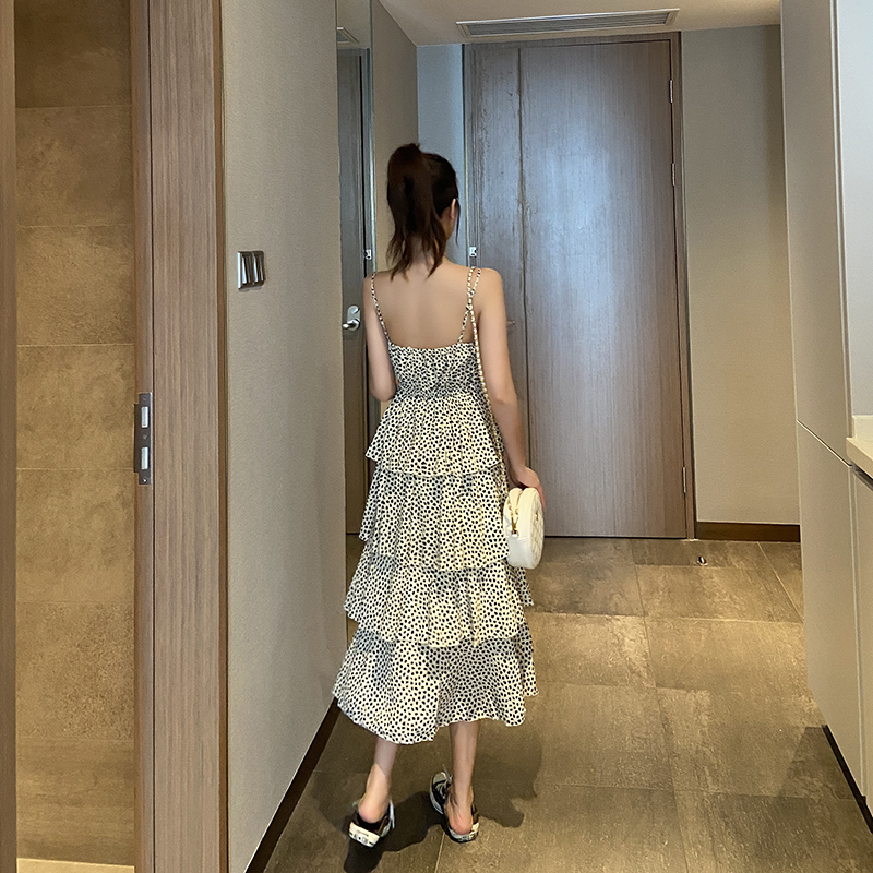 Wave Dot Harnesses Foreign Dress Women 2021 Summer New French Broken Flowers Snowspun Skirt Cake long dress Sexy Skinder