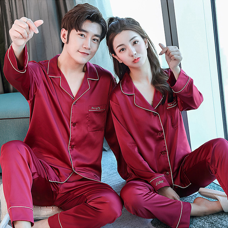 Couple sleepwear women Summer ice silk Two-style suit Spring and Autumn Real Silk Short Sleeve Men's Summer Thin family clothes